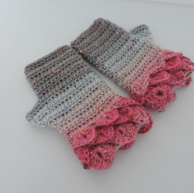 SALE was £12.50 now £7.50 These fingerless dragon scale cuff mitts have been crocheted in an acrylic and wool yarn. A striking graduated coloured yarn of mid grey, pale grey and pink with a smattering of tweedy bits throughout. . Dragon scale cuffs and a plain body. Warm and cosy, ideal for the cold weather
