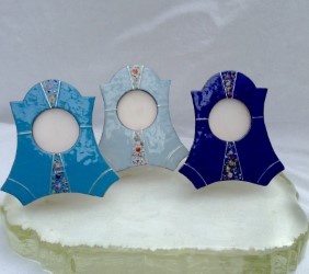 This lovely photo frame measures approx.3" x 3" at its widest point.. It is made from 1.2mm pure copper and I have enamelled the front , approximately 5 times firing to 800 degrees C. I have added sterling silver wirework, and glass flowers,which I have fired fusing into the molten enamel.