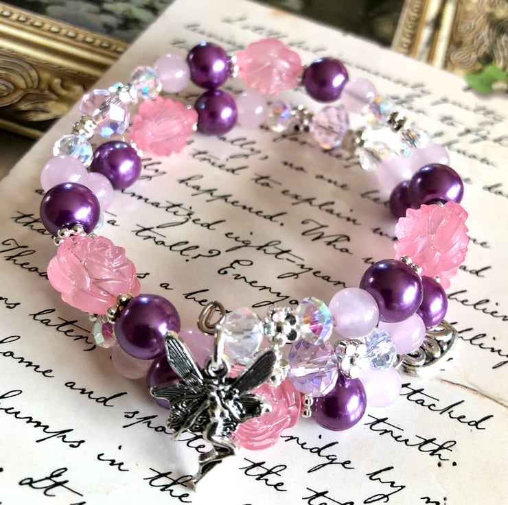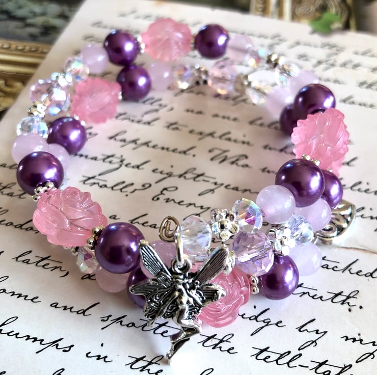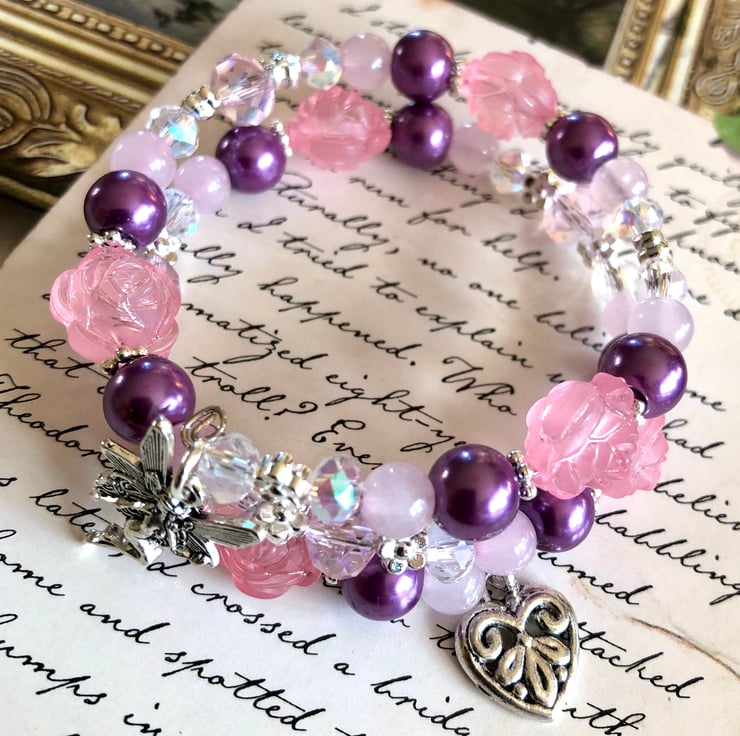 I have added some beautiful pink rose beads, rose quartz beads, purple pearl beads, Aurora Borealis beads and some pretty silver flower spacer beads.