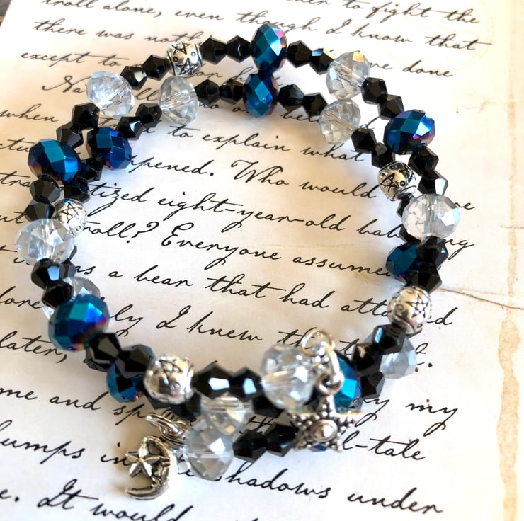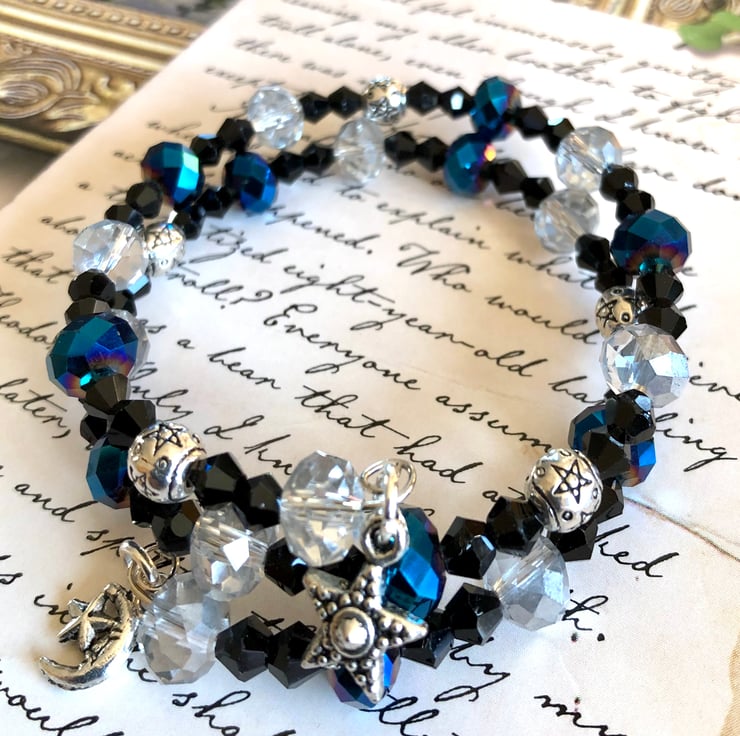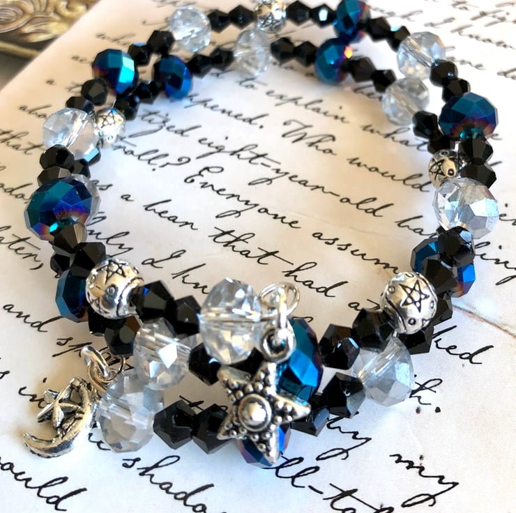 I have added some stunning blue faceted crystal beads. These beads are so pretty and have flashes of purple in them when the light hits them. I have also added some black faceted beads, some silvery faceted beads and some lovely silver spacer beads that have stars engraved on them.