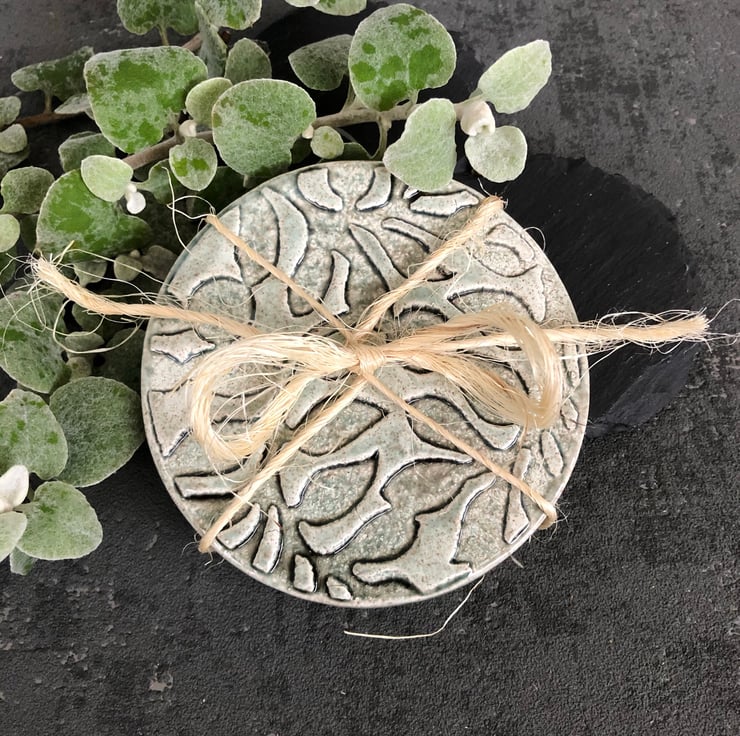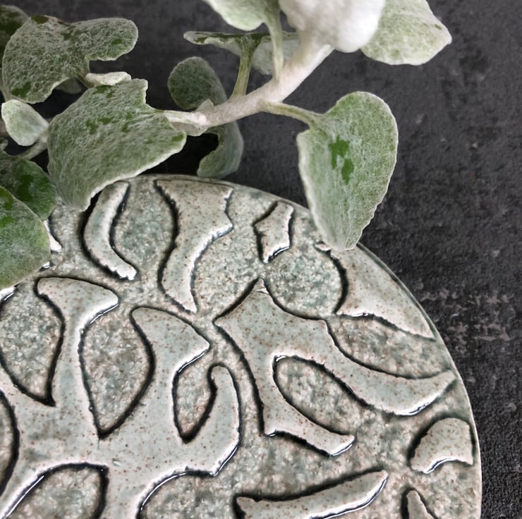 A set of 2 ceramic coasters made with a white earthenware clay, and finished with a botanical textured pattern and willow green glaze. Each coaster also has a cork bottom to prevent scratches to furniture.