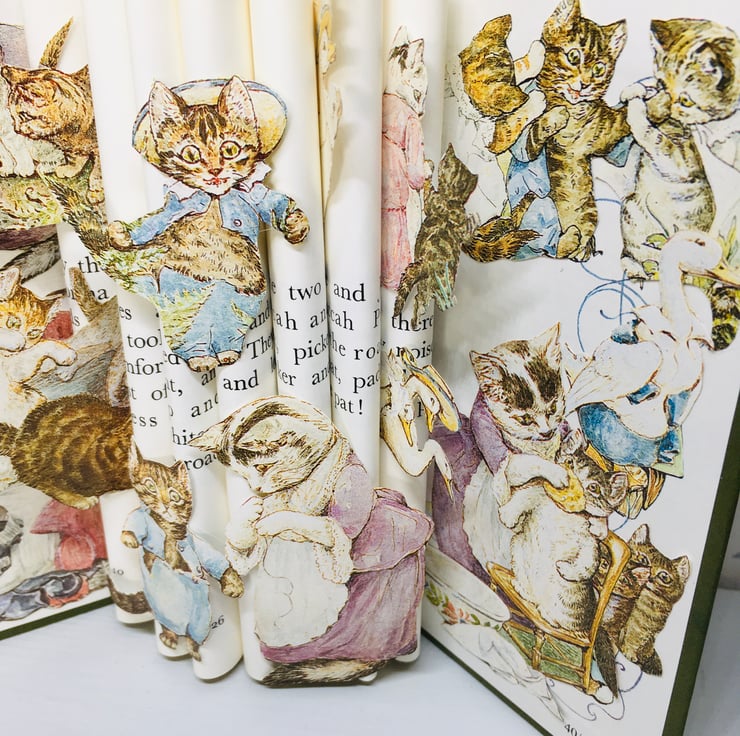Beautiful hand-cut Tom Kitten from Beatrix Potter’s Peter Rabbit collection. The collage made from a pre-loved vintage book. Perfect gift for children’s rooms, baby showers or sentimental adults like me! If you would like it in a display case, please choose an option!
