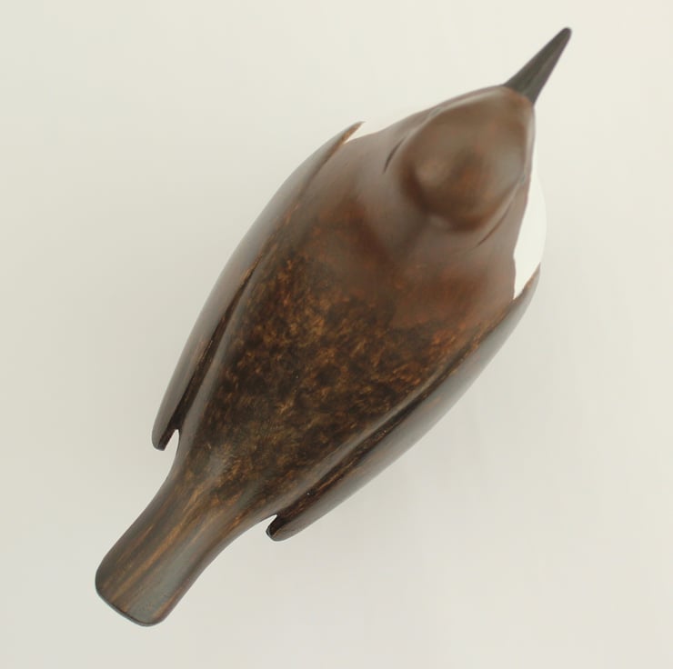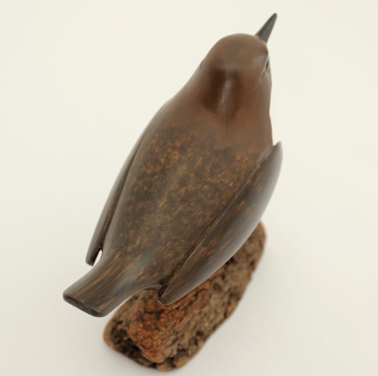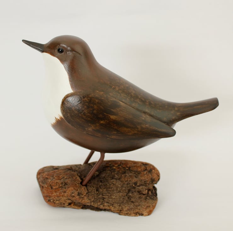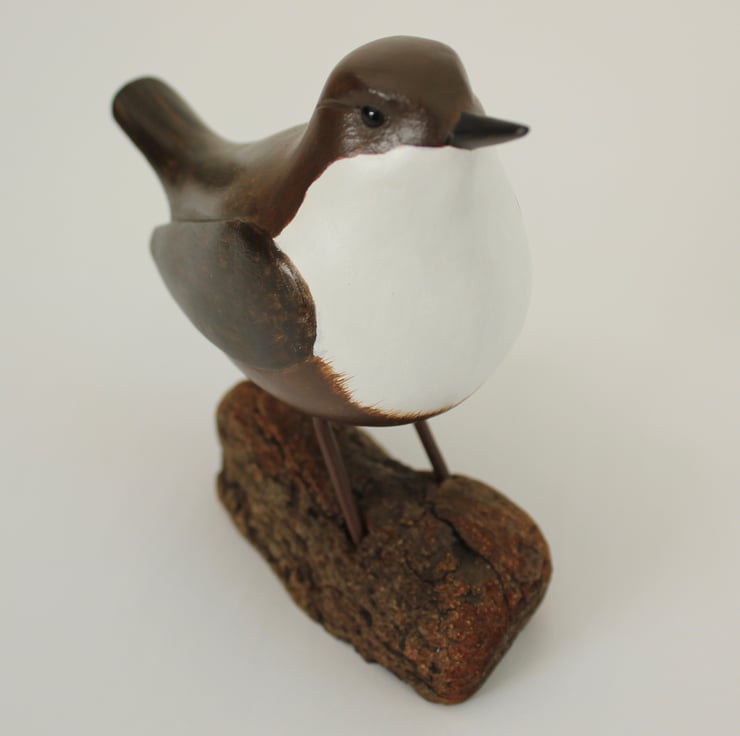 This dipper has been hand carved from wood and then painted with artists acrylics. It has raised wing detail and has hand painted glass eyes and is finished to a soft shine with wax. It has bent brass legs and is mounted on a lovely piece of driftwood that looks like a typical river perch. The piece is 14cm from beak to tail, 6 cm deep and 13 cm tall overall.