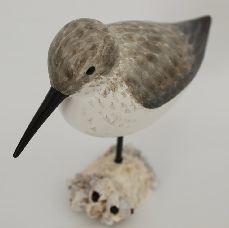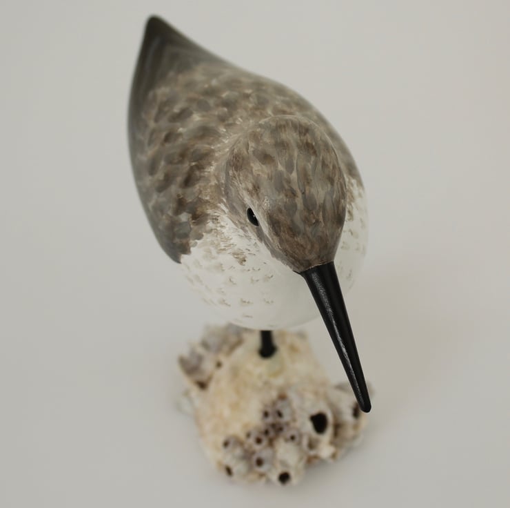 The bird has been given a finishing coat of wax giving it a soft shine. Each of my birds is unique and would make a lovely present. This dunlin is 16cm from beak to tail, 6cm deep and 14cm tall, perfect for a small shelf or window sill. SN417