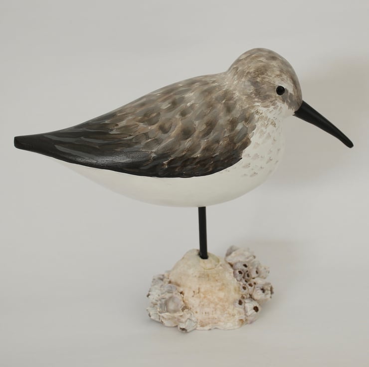 This hand carved dunlin has been made from wood, sanded and then painted with artists acrylics. It has black glass eyes and has been mounted on a barnacle encrusted limpet.