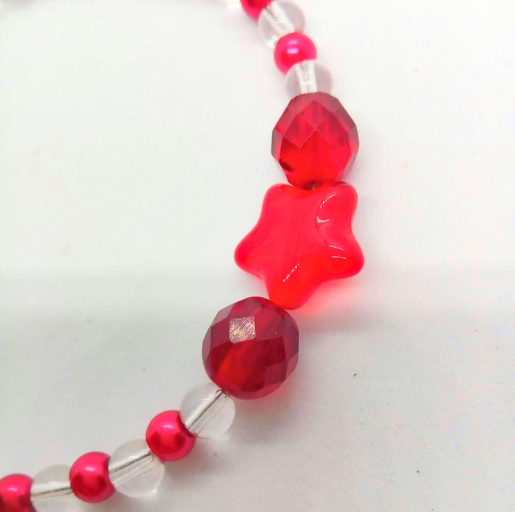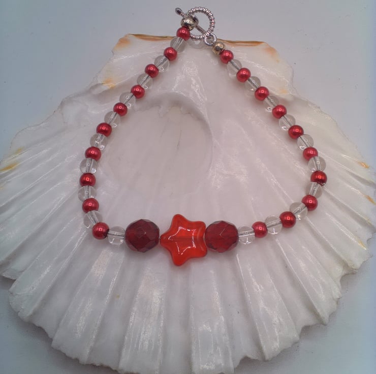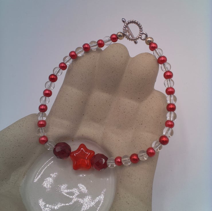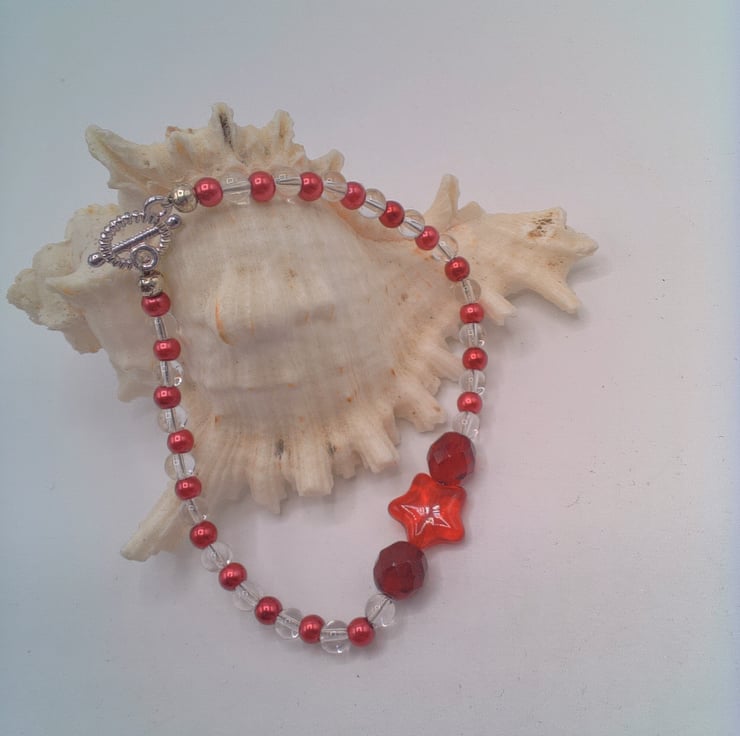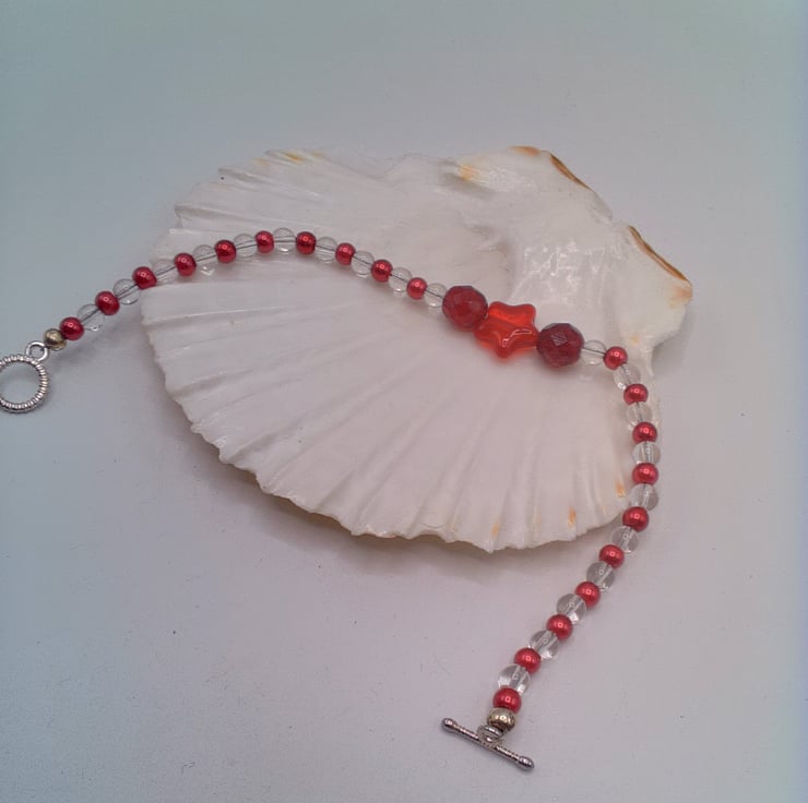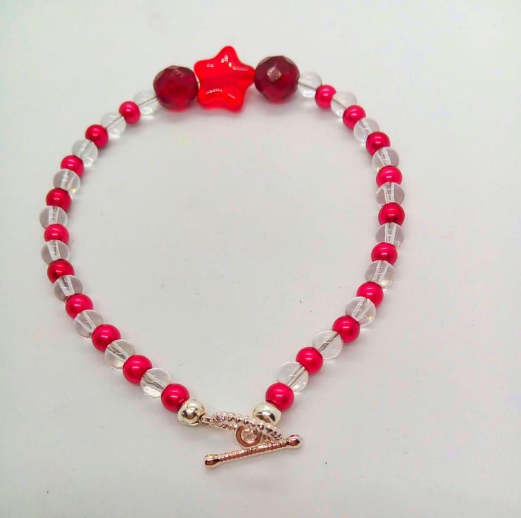 This cute bracelet would go well with any of your Spring or Summer outfits that you wear for everyday or for a special occasion. It would be a lovely gift for a friend or relative for a birthday or anniversary, or a treat for yourself. The bracelet is made using 4 mm red pearls and 4 mm clear glass beads with a 10 mm bright red star centre with an 8 mm red crystal either side of it. It measures 7.5 inches (9 cm) long and is fastened with a silver plated toggle clasp. The bracelet will be dispatched wrapped in tissue paper in an organza bag. The bracelet will be dispatched wrapped in tissue paper in an organza bag and delivered to you via Royal Mail first class post.