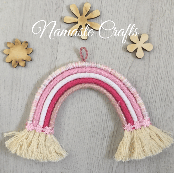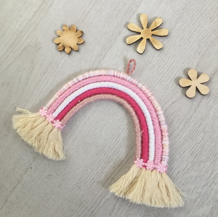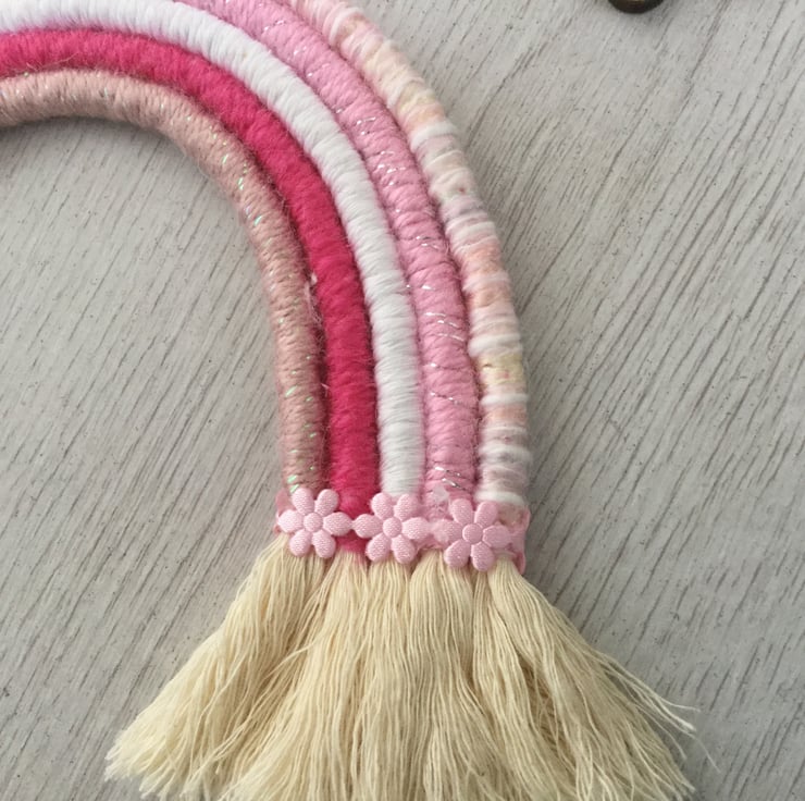 Beautiful unique hand wrapped macrame rainbow wall hanging made using a variety of textures. Close to the fringe I have embellished with pretty pink Daisy ribbon.
