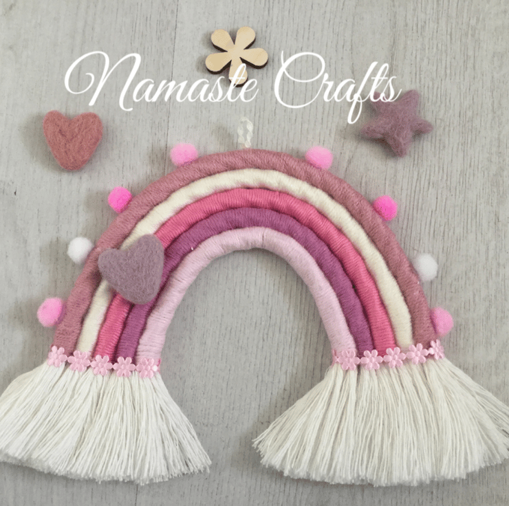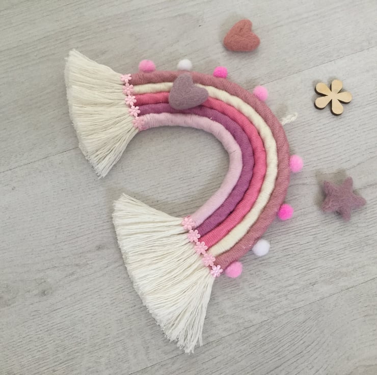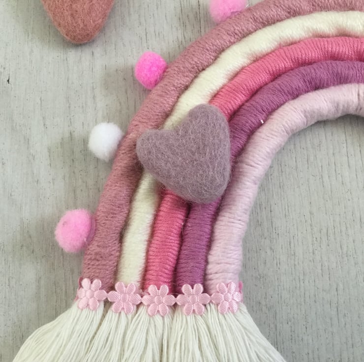 Beautiful unique hand wrapped macrame rainbow wall hanging made using a variety of textures. The outside of the rainbow is decorated with little co ordinating pom-poms and I have places a hand needle felted heart on the front .