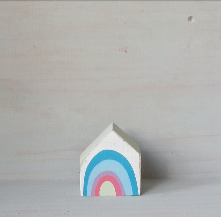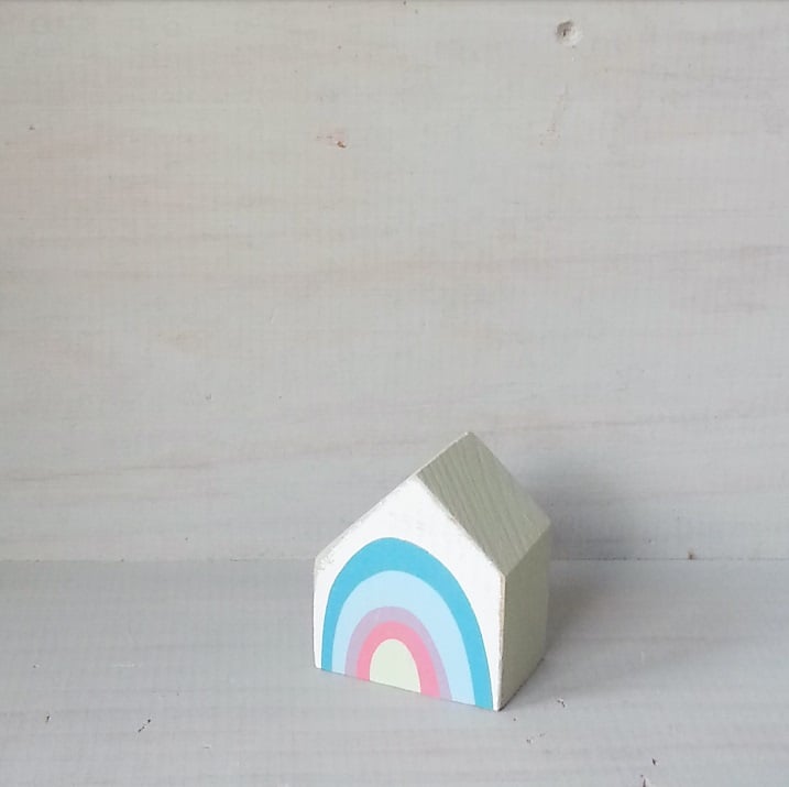 This one of a kind little wooden house is made from reclaimed wood and is painted in sage green and white, and is decorated with a rainbow transfer, with a mini rainbow on the reverse.