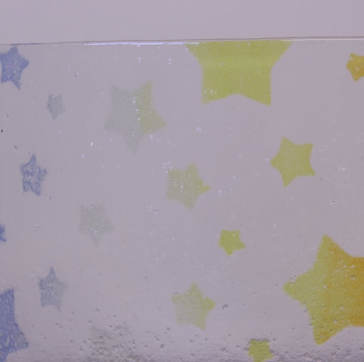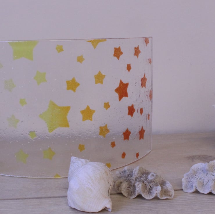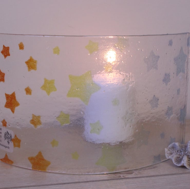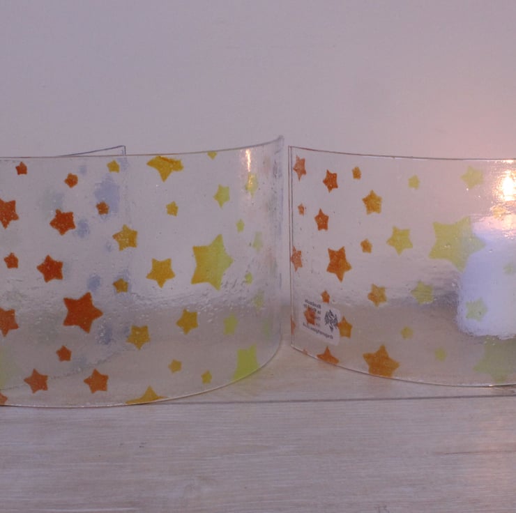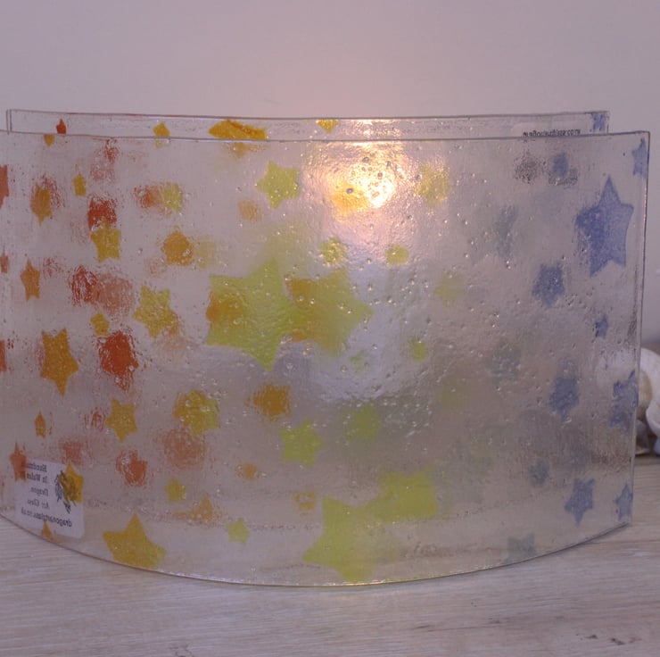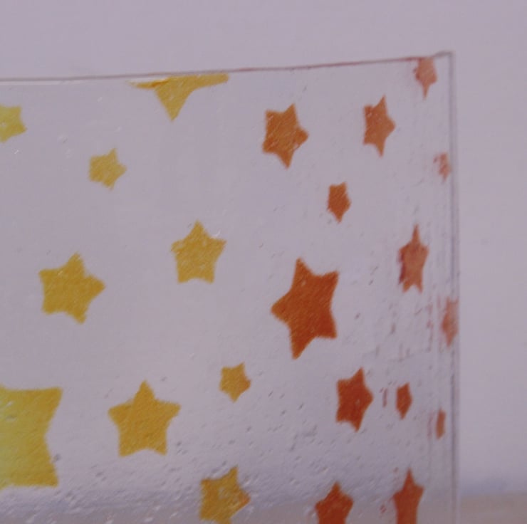 This multicoloured fused glass stars candle screen was made by screen printing a mix of fine glass powders onto the glass.