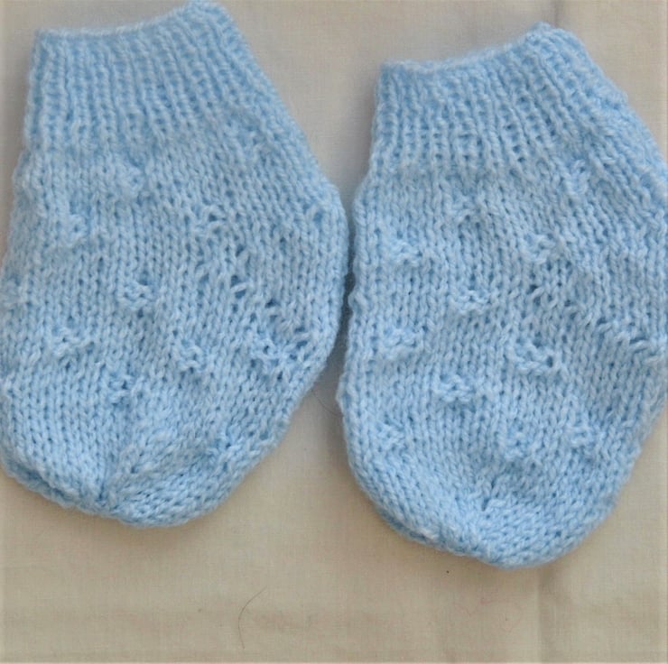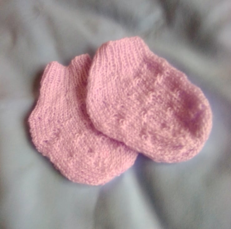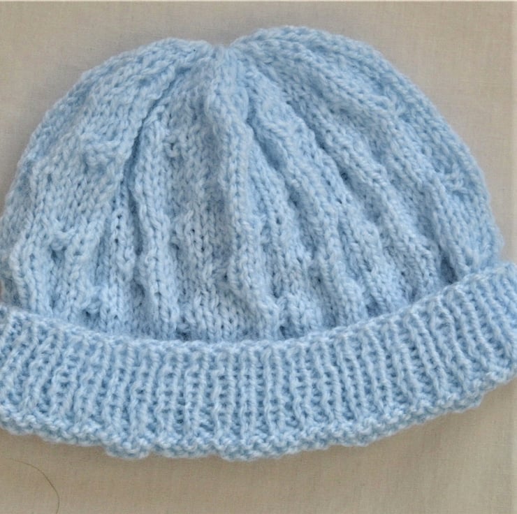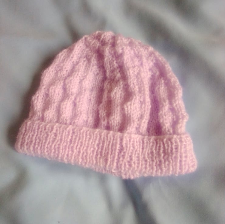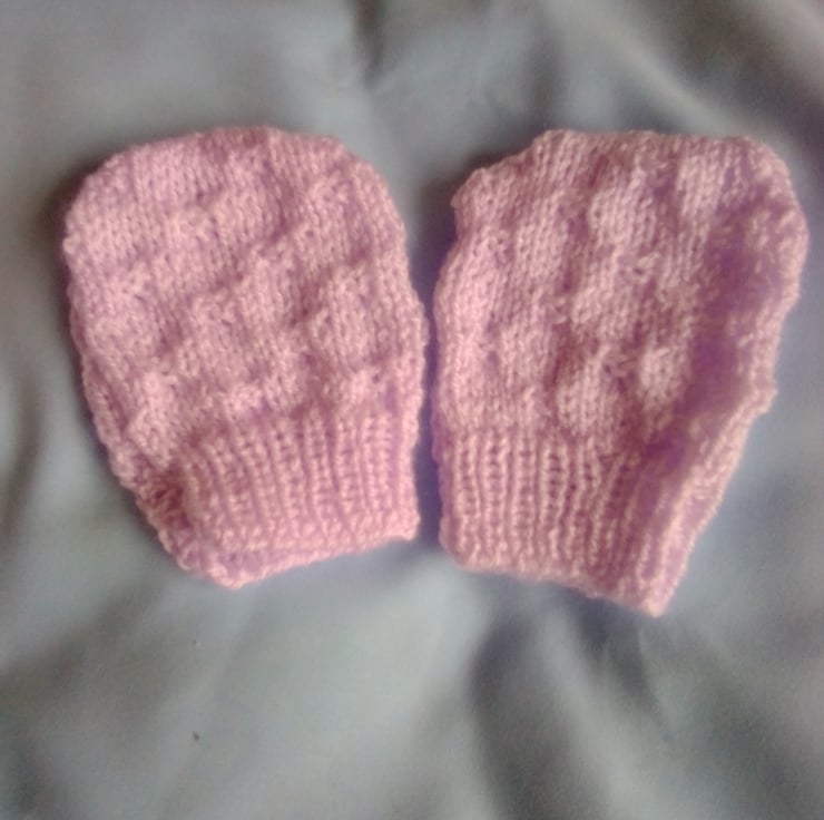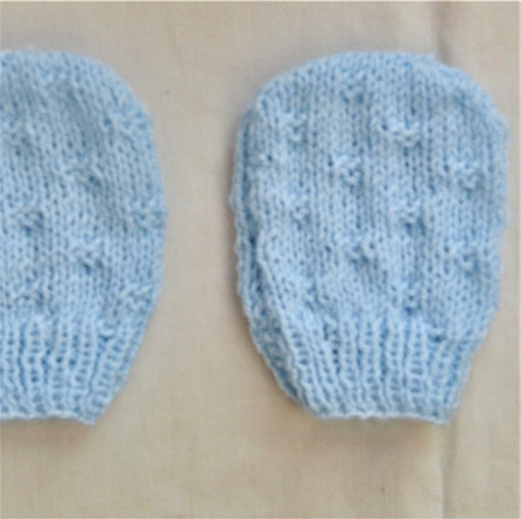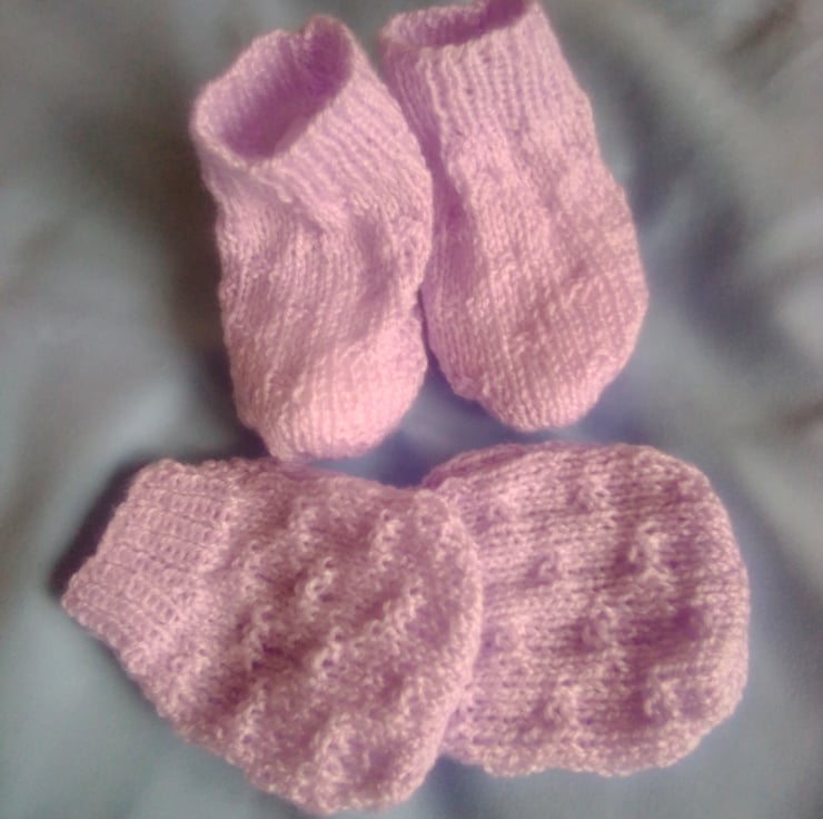 3 piece basketweave hat set, including a hat, a pair of mittens and a pair of baby socks for babies from premature up to 6 months. The set is in stock in the lilac colour shown in a size to fit a 0 - 3 month old baby. It can also be knitted for you in a size and colour of your choice, available sizes are shown below and state the colour required when you order your set. Please allow a processing time of approx. 1 - 2 weeks for your hat set to be produced and sent to you.