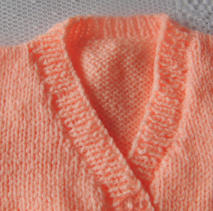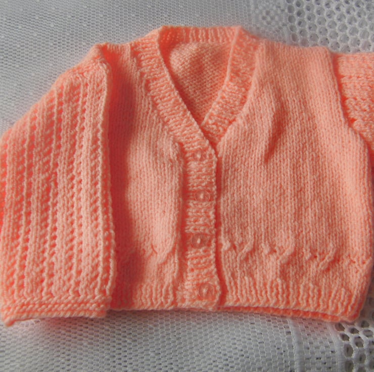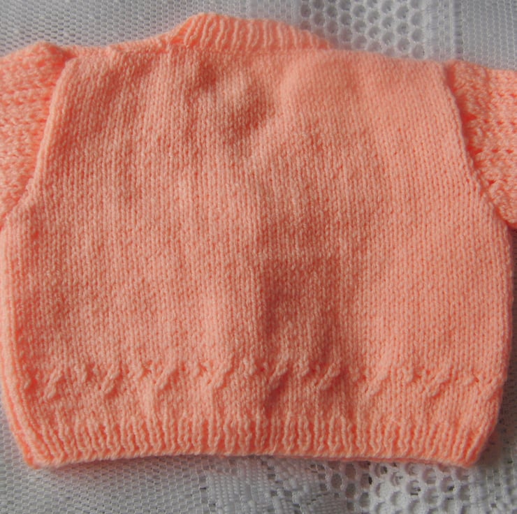 Very Pretty Cardigan with inset lacy patterned sleeves and a patterned border. It is hand knitted in peach coloured double knitting yarn to fit a baby girl 0 - 9 months old with a 16 - 18 inch chest. It is in stock ready to be posted to you but if you require it in a different size or colour then please allow 1 - 2 weeks for it to be made and posted to you.