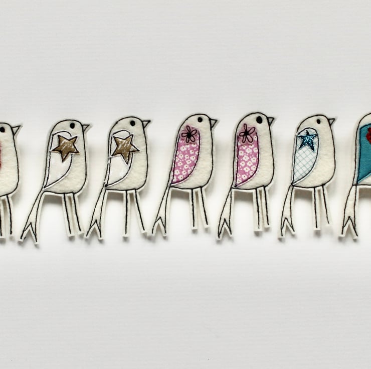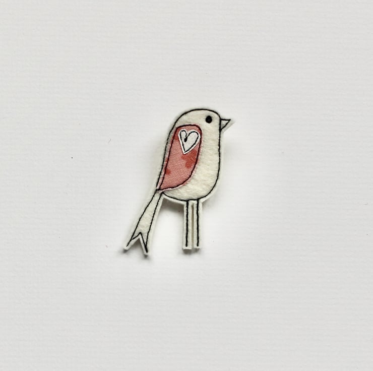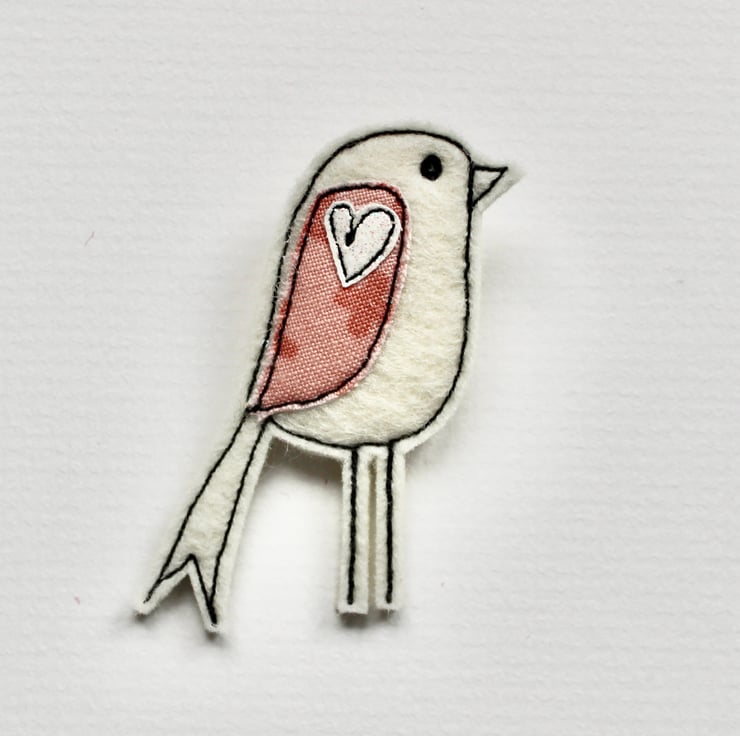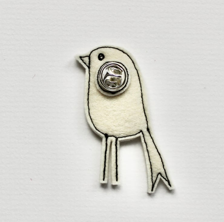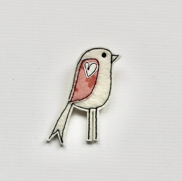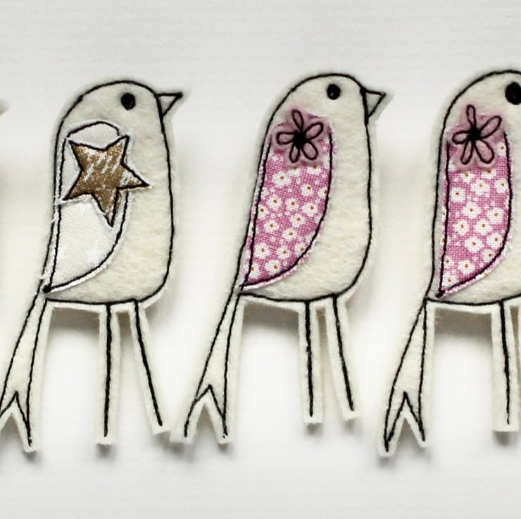 Each brooch is created using multiple layers of 100% wool felt, cotton cloth, sewn using freehand machine embroidery and then cut out by hand. The pin on the back is attached with hot glue.