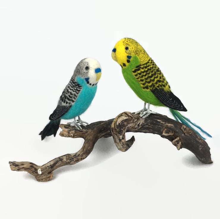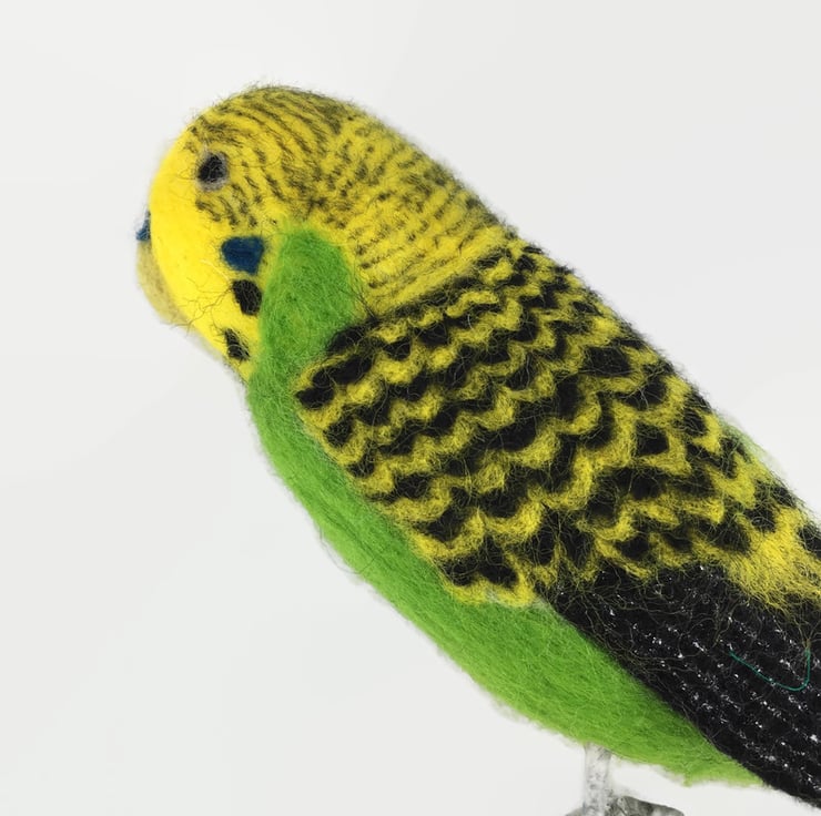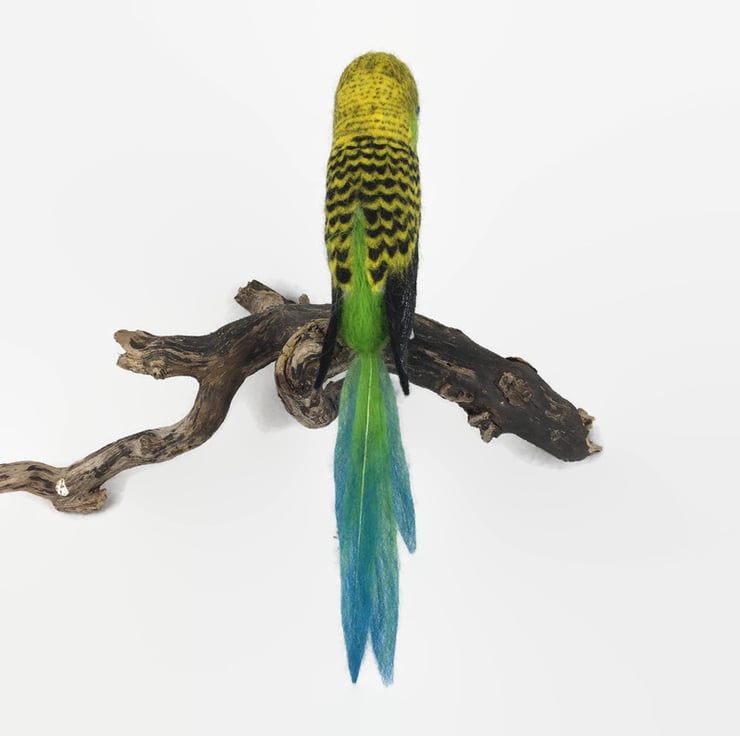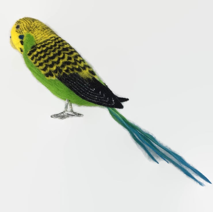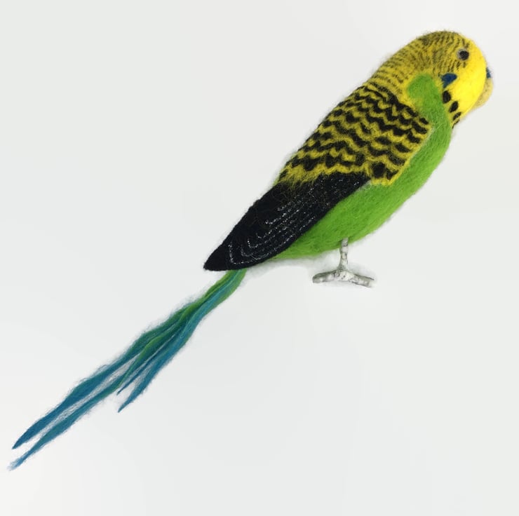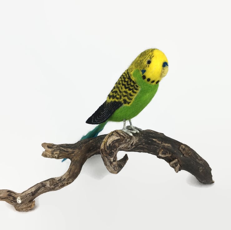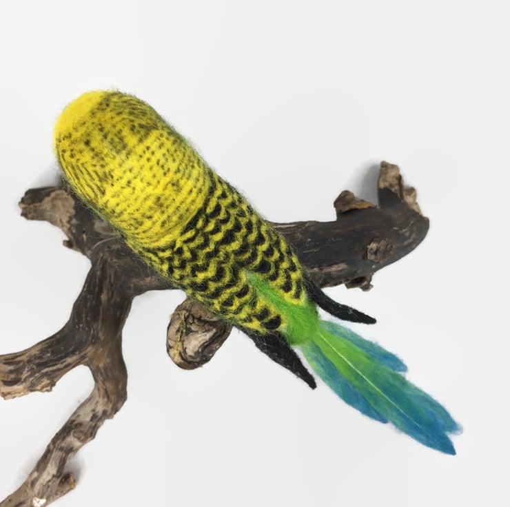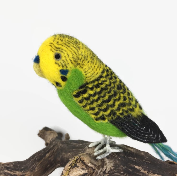 This green and yellow budgie or parakeet has been needle felted using woollen fibres and a barbed felting needle to sculpt it into shape. The long tail feathers have a wire central core and the feet have been made using wire wrapped in wool with a light covering of wax. The budgie is approximately life sized and measures 25cm (10") long, from top of head to tip of tail. He can be perched on a log or on the edge of a shelf. Note: the log shown in the photos is for illustration only and is not included in the listing.