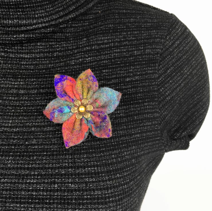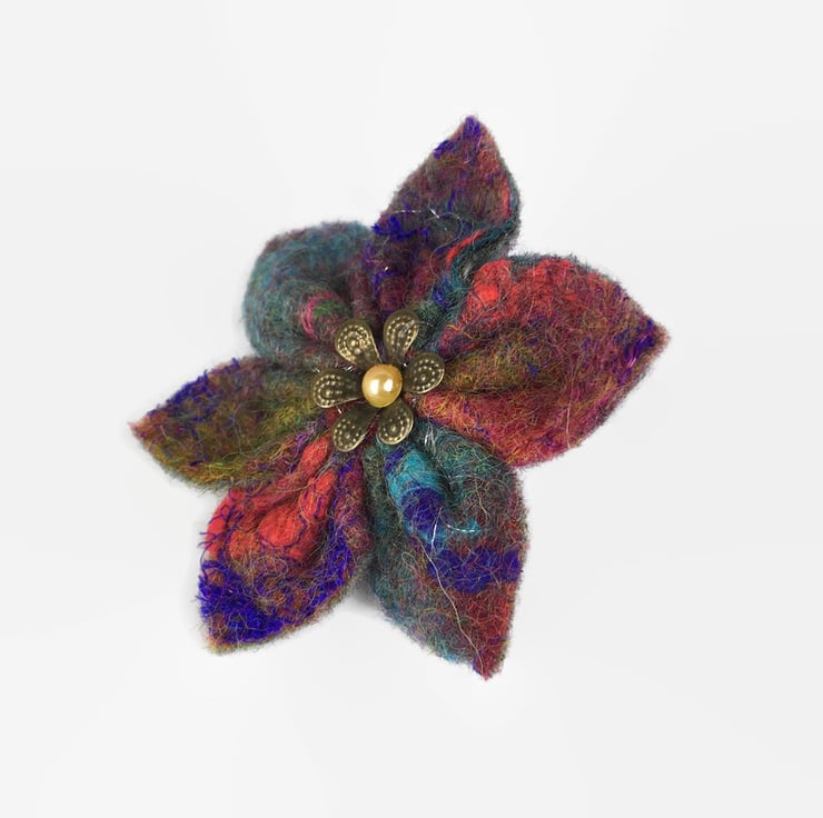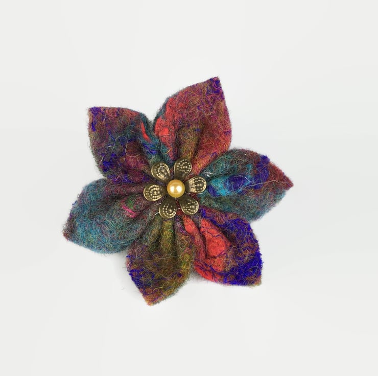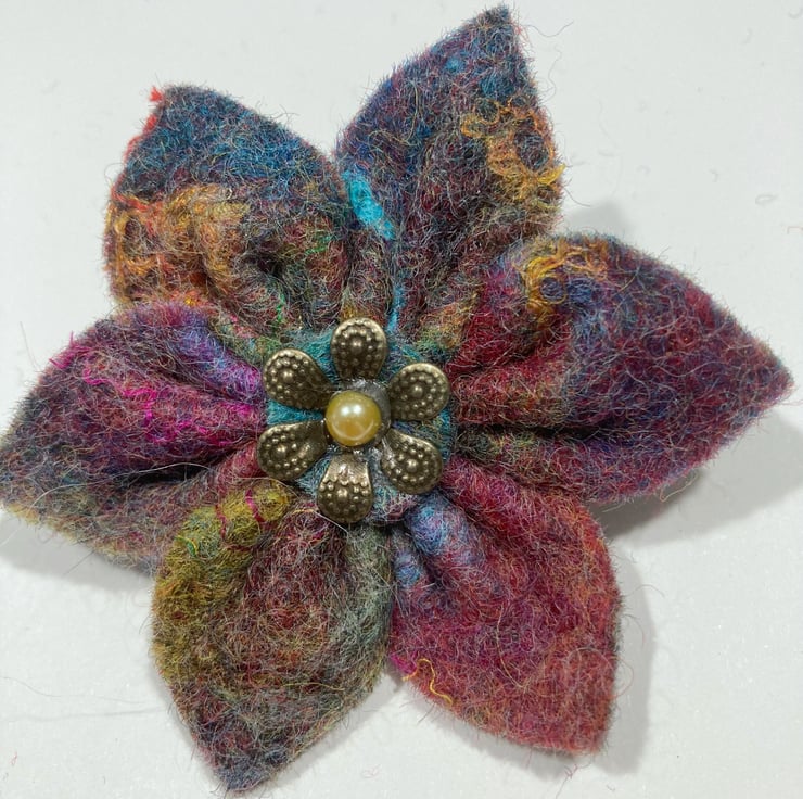 This felt flower brooch has been made using a piece of hand made felt. Corriedale wool in lots of different colours has been wet felted and embellished with silk fibres. Pieces have then been cut and stitched to form a pretty flower. The centre of the flower is decorated with an "antique bronze" petal shape with a golden yellow half pearl, The brooch is finished with a silver tone brooch pin on the reverse.