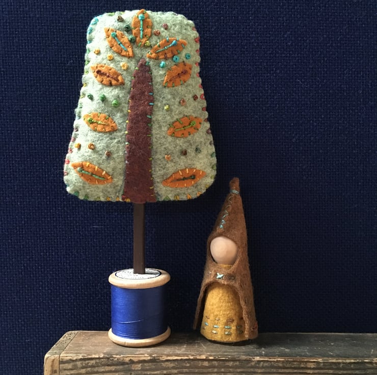 A cute little hand made tree, standing proudly on a vintage cotton reel.
