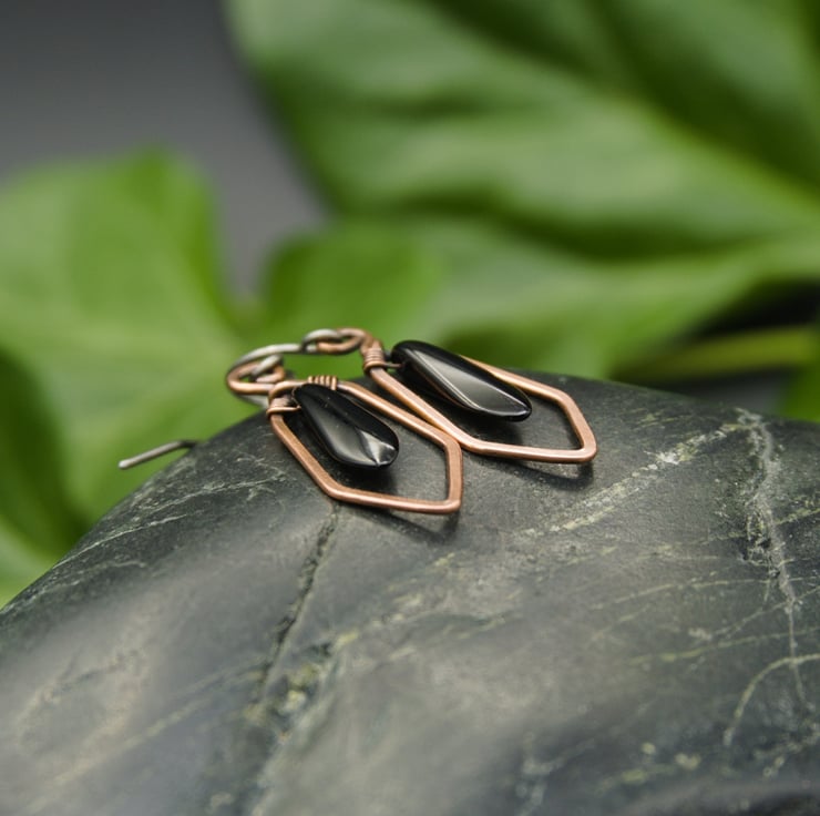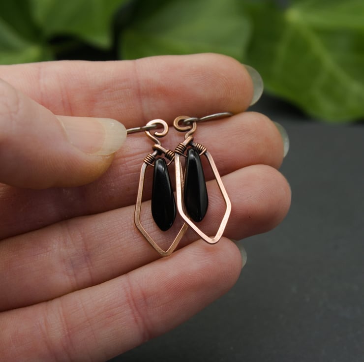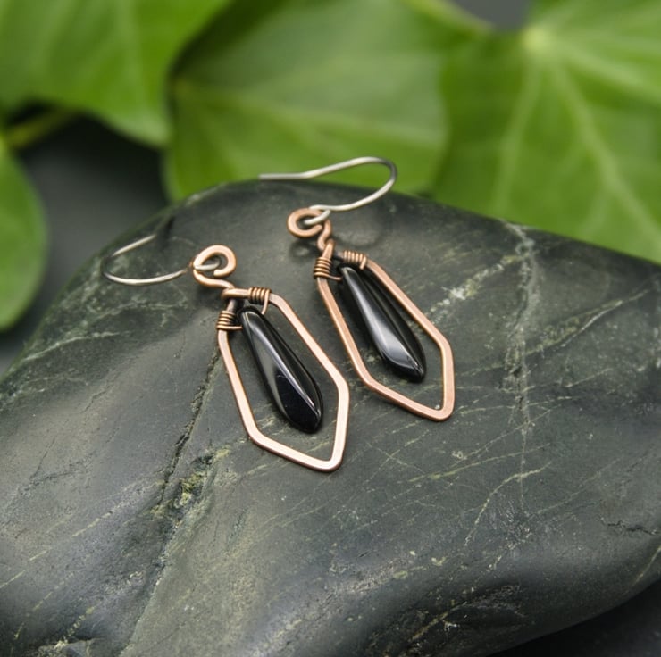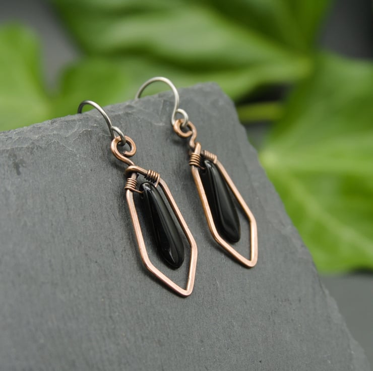 These striking earrings feature black glass dagger beads. I've formed frames for the beads using copper wire, which I've hammered flat. The beads are attached with fine wire so that they hang & move within the frame. The tops are finished with hammered spirals, which attach to the handmade niobium hooks. Niobium is an unalloyed metal which is great for those with a metal sensitivity.