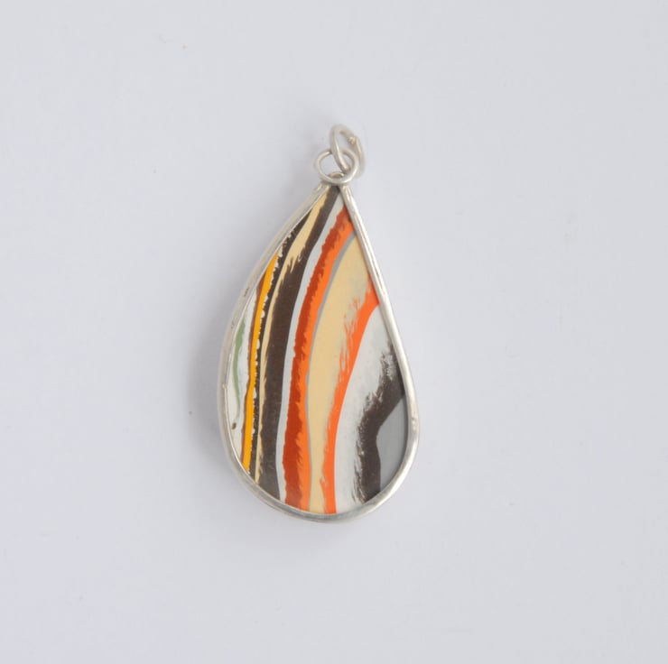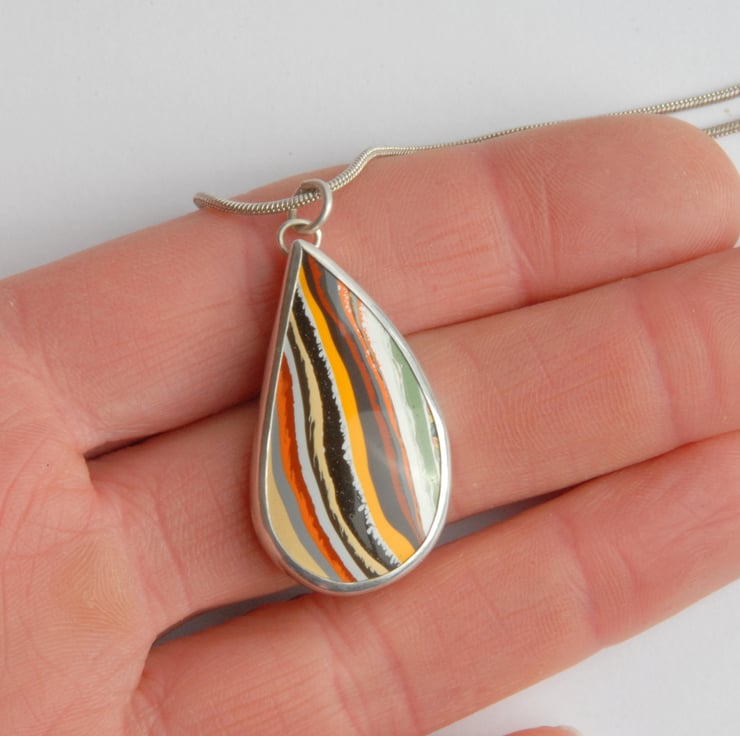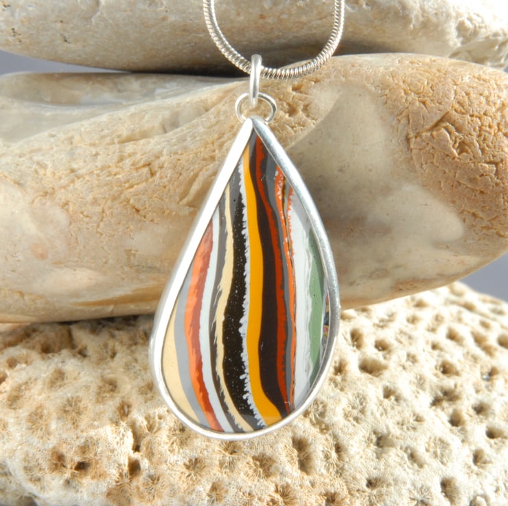 This free form pendant features an unusual cabochon of vintage boatite, the organic shape has been smoothly bezel set in sterling silver and its finished with a simple loop bail. It has sort of vertical stripes in autumnal shades of yellow, brown, orange and white, the stripes don't have crisp edges and the feathering adds to the organic feel of the piece. Measures 38mm (inc bail) by 20mm wide and comes with a silver snake chain in a gift box.