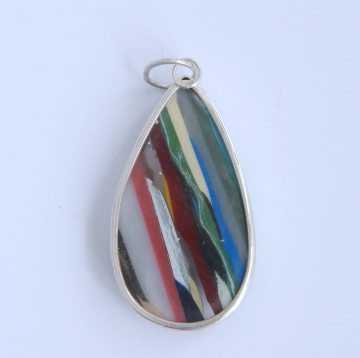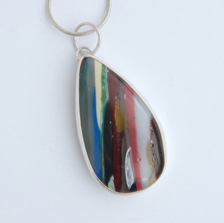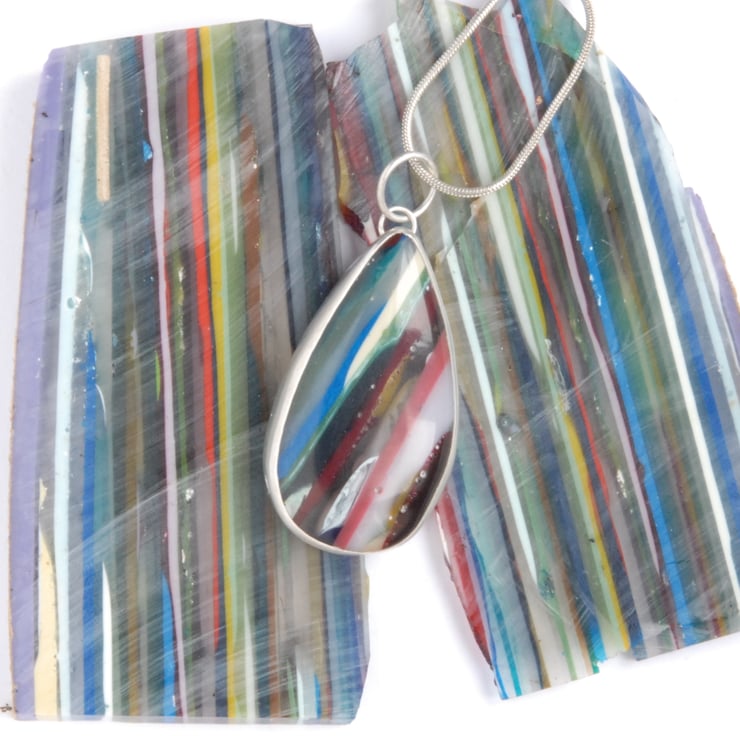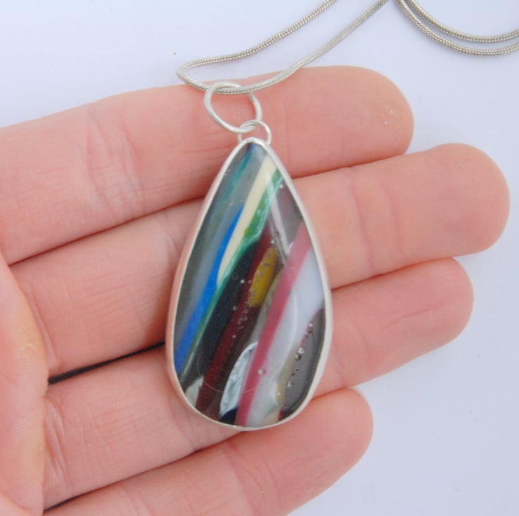 This classic teardrop shaped pendant is given a modern twist with an unusual choice of materials, it features a colourful piece of Californian surfite which has been bezel set in sterling silver. The surfite has a mixture of clear and opaque bands in white, pink, dark red, blue and green, the open backed setting means you can peer through it and see the little air bubbles trapped inside it where the layers meet. There are a few dimples on the surface caused by the air bubbles. This is quite a sizable pendant measuring 50mm (inc bail) by 24mm, it comes with a silver chain but you could easily pop it onto a rubber cord or ribbon if you wanted to. Comes in a gift box and would make a great gift for the Californian or surfer in your life.