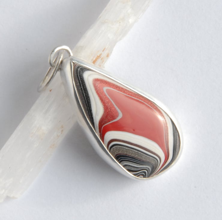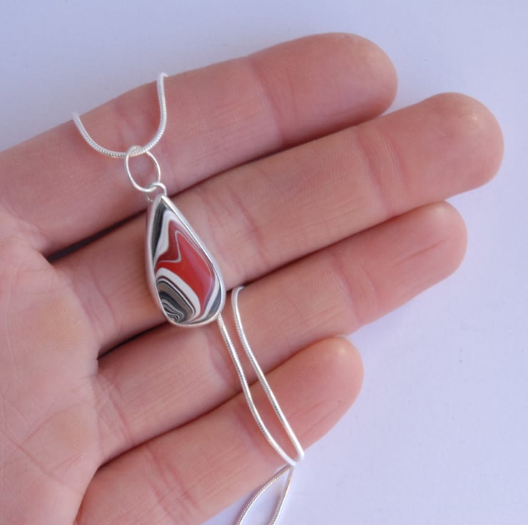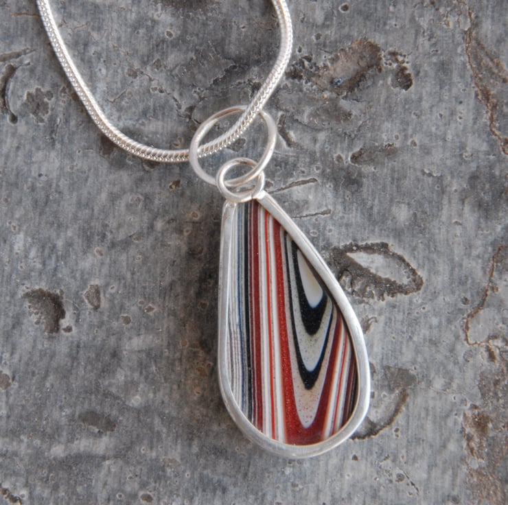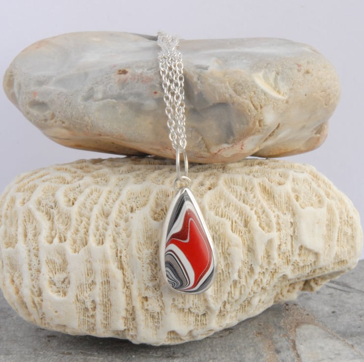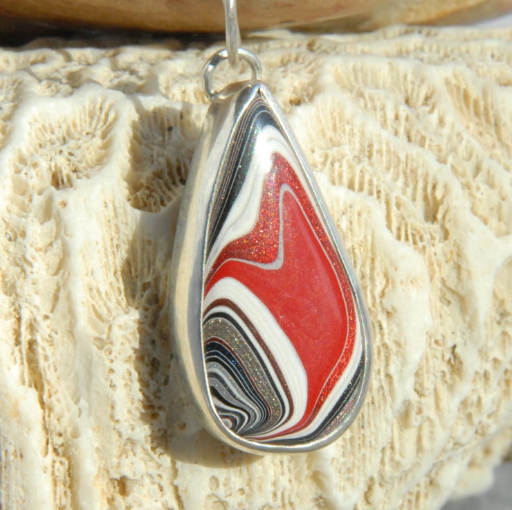 This cute little pendant features a drop of fordite bezel set in sterling silver. The pendant has an open back so can be reversed as the colour palette and patterns are different on the two sides. The front is predominately red with some sparkly cherry red, white and sparkly silver whilst the back is is a darker red with white, black and grey. The fordite measures 23mm by 12mm excluding the generous bail, it comes with an 18inch sterling silver chain but the bail is big enough to take a leather or rubber thong (please drop me a message if you would like me to sort this out for you). Comes gift boxed.
