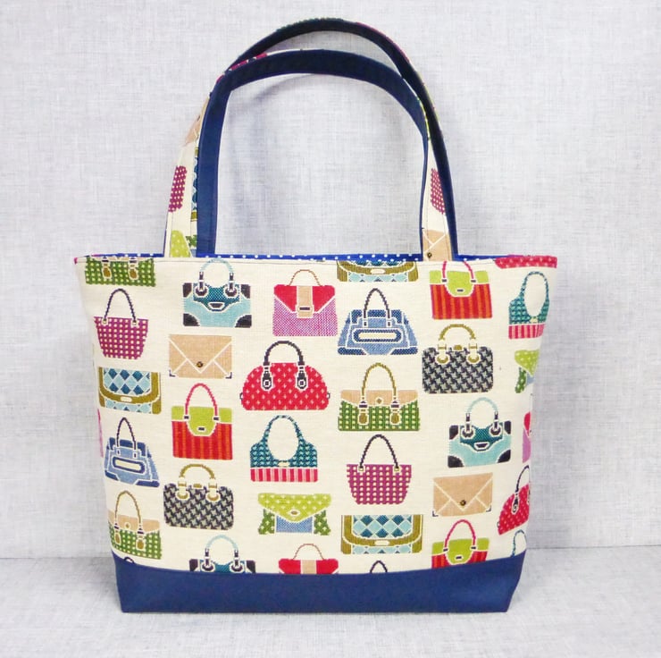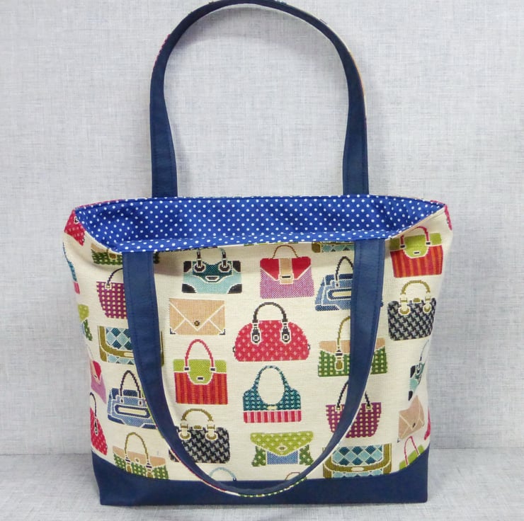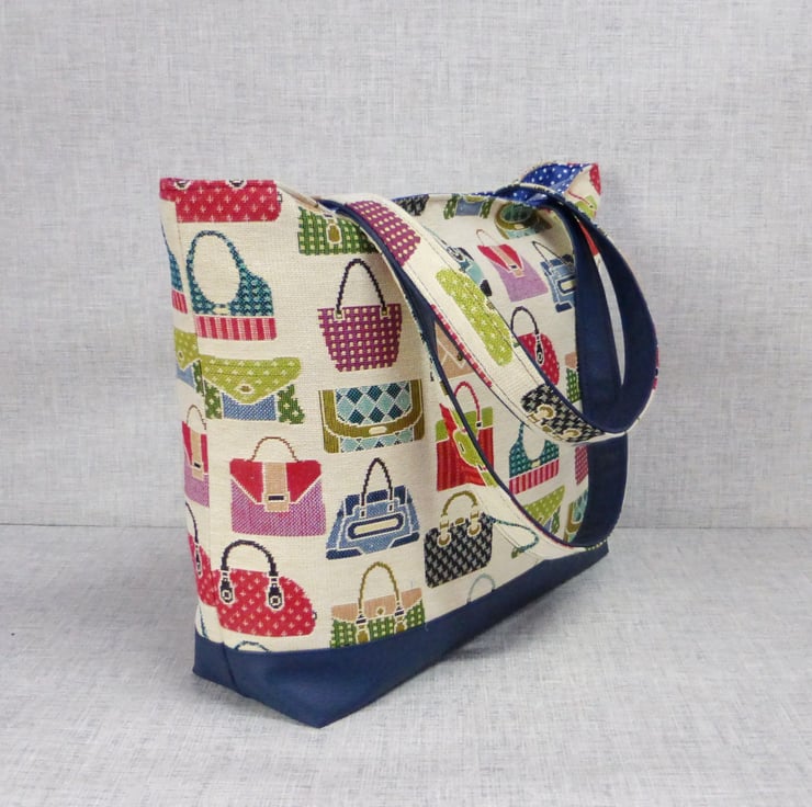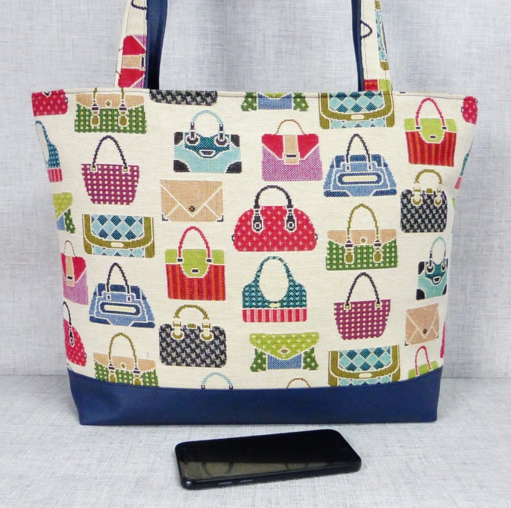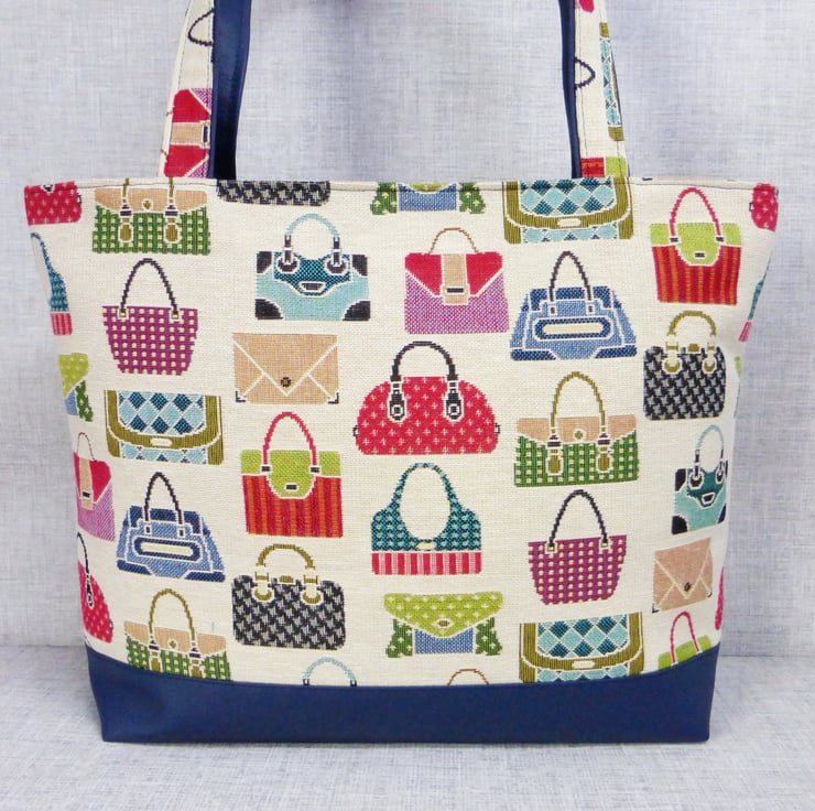 A tote bag made from a tapestry canvas fabric with a handbag design, and navy blue faux leather.