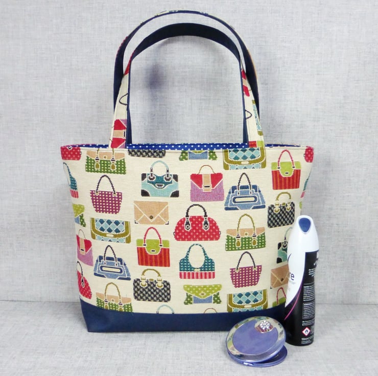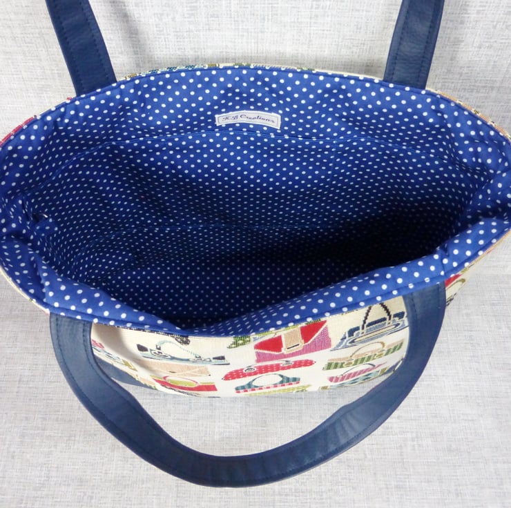 The tapestry fabric has a handbag design in various shades of red, blue, green and taupe on a cream background and is 80% cotton, 20% polyester. The lining is 100% cotton in light navy blue with a white spot design on it.