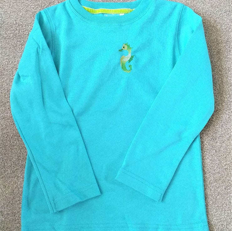 This is a lovely turquoise long sleeved T-shirt, for a 7 year old. On the left front I have hand embroidered a variegated green seahorse from a sketch of my own. The motif is 3" (8cm.) high. The shirt has a soft velvet band inside the back of the neck. It is 100% cotton and machine washable. In my opinion the shirt is equally suitable for a boy or a girl, though the manufacturer has labelled it 'Sunshine Boy'