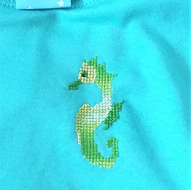 I thought I'd try a new venture, and embroider T-shirts with long sleeves, including a few for slightly older kids. This watery turquoise shirt suggested the seahorse motif.