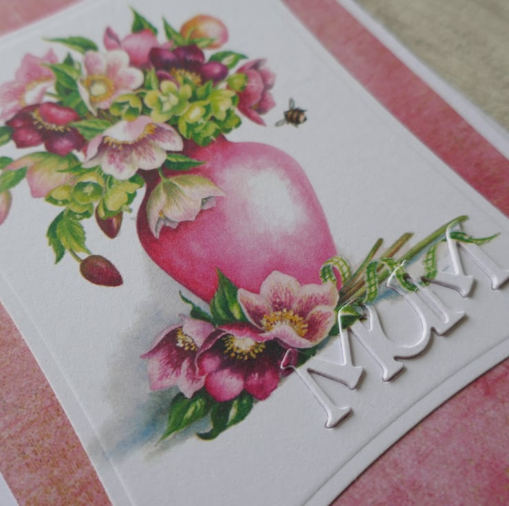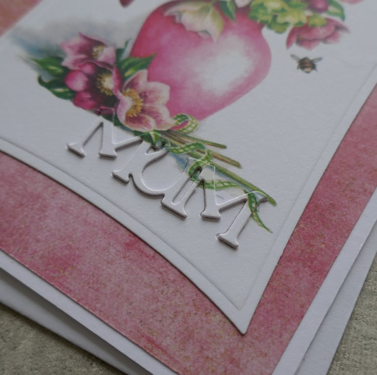This card measures approximately 5.5" x 4.25" and is made from white matt card. A piece of pink paper had been attached to the front of the card leaving a white border around the edge. The precoloured Lili of the Valley floral image has been die cut into a wonky rectangle and attached to the centre of the card. 'MUM' has been die cut from the lower edge of the image and raised to give some dimension to the card front.