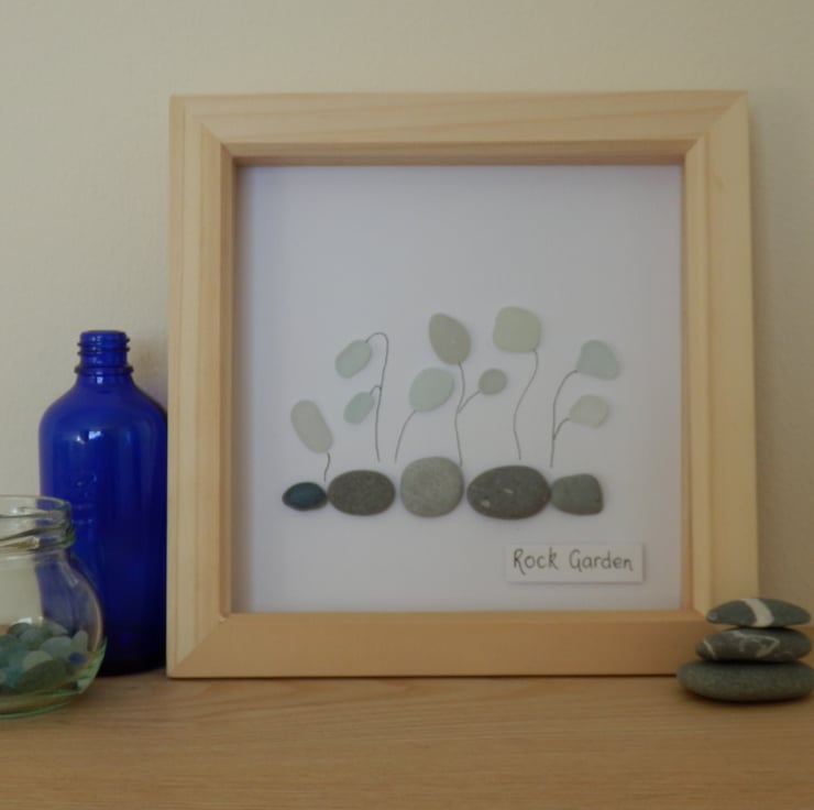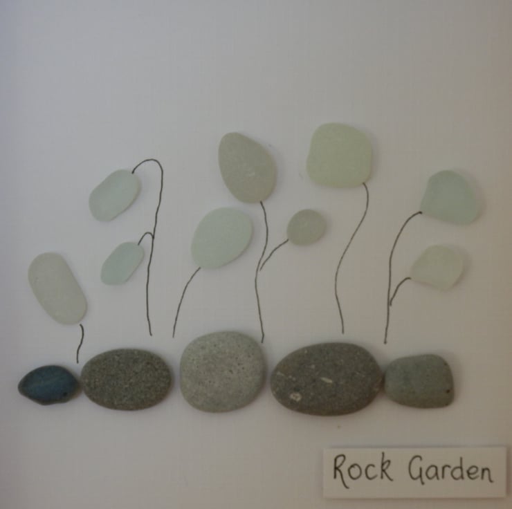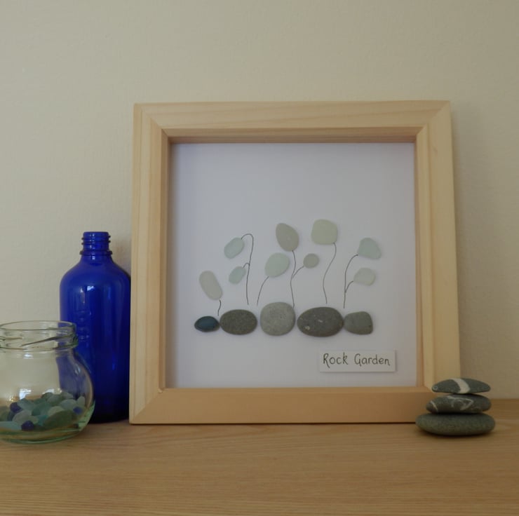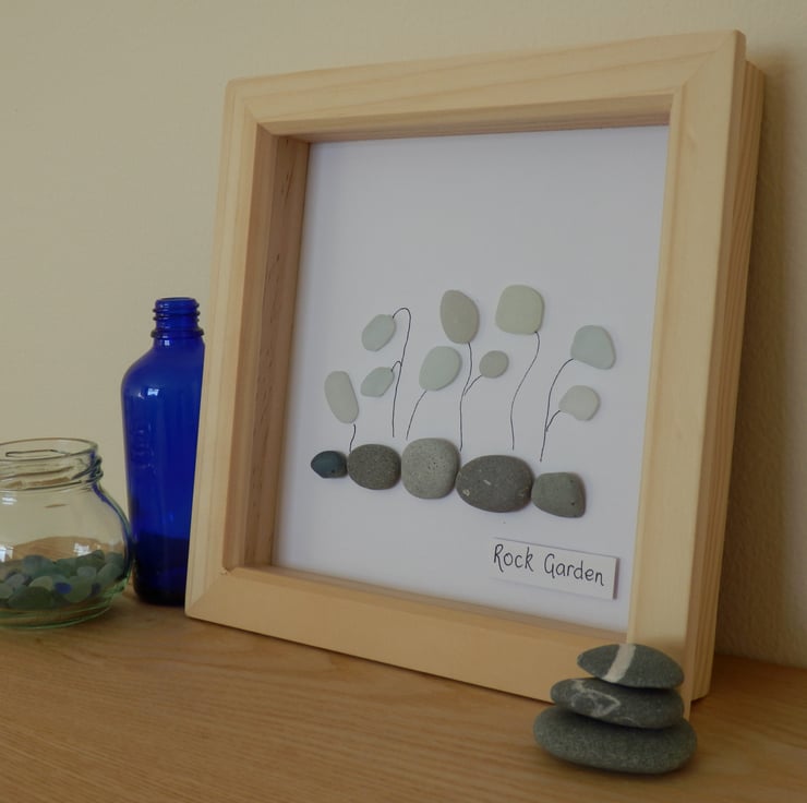 This is my first design when I began making art from sea glass. It is called 'Rock Garden'© and each one I make is different in colour and shape of sea glass and pebbles. This one is in muted shades of pale blue and grey and is a lovely piece of beach art.