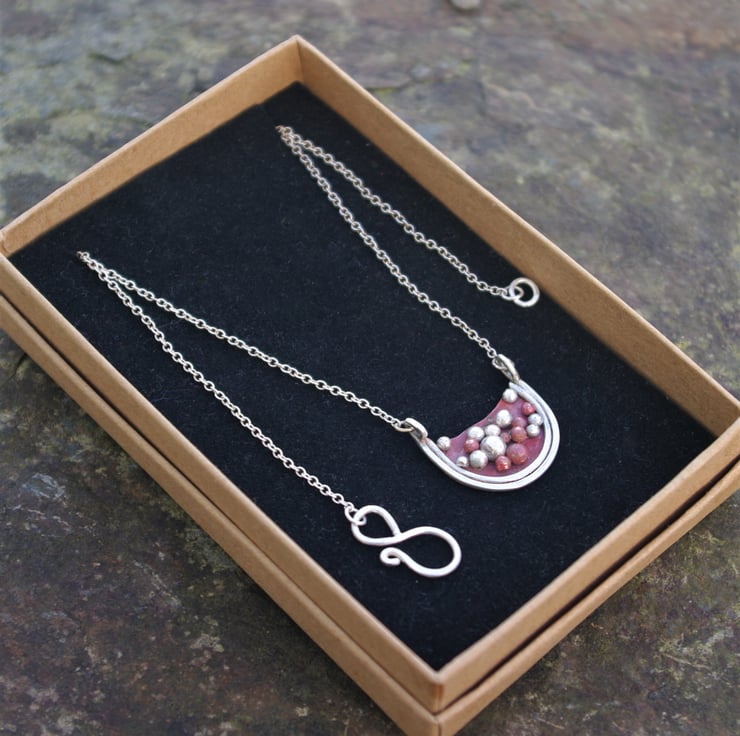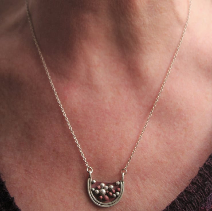 A half moon shaped silver and copper pendant, inspired by the seed pods. The silver and copper seeds are soldered to a piece of copper , enclosed by flattened silver wire on the curved edge, which extend to form the rings to attach the chain . The copper has gained luscious dark red/pink/ copper tones as a result of heat and these are preserved with penetrating wax.