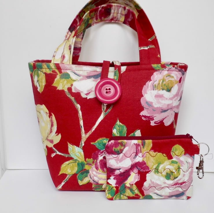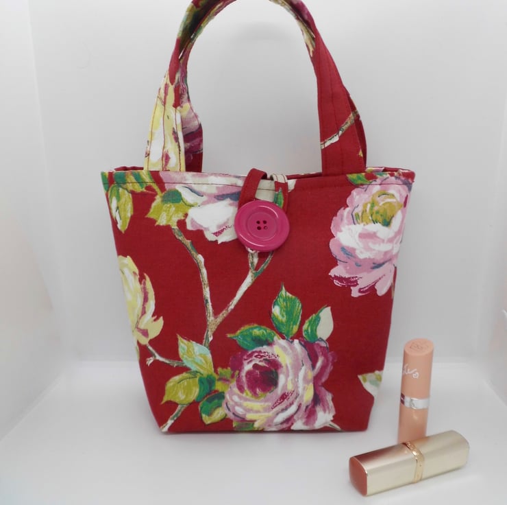This hand bag is made from a medium weight cotton fabric called 'Amaya'. Red background with pink rose print. I backed the fabric with fusible fleece to give it body and maintain shape. Faced inside at the top with the same fabric, and then lined with a green and grey striped cotton fabric. Inside there is ring on which to clip your keys or other essentials and the bag can be fastened with a loop around a big pink button which came from my button box. The two handles are topstitched, and measure 31cm.
