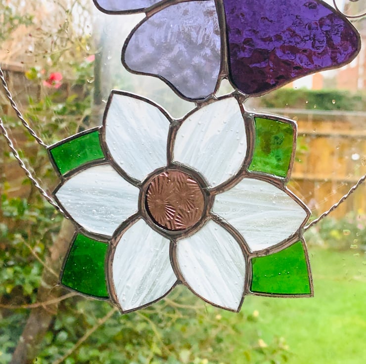 The butterfly has been made from purple corella glass, mauve muffle glass and pink muffle glass. Twisted wire for the antenna. The flower has been made from White streaky sea glass with pink florentine glass and a lovely green sea glass for the leaves. I have used a twisted tinned wire for the circle and scroll to give a little more structure.