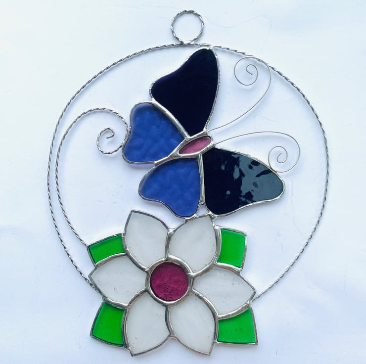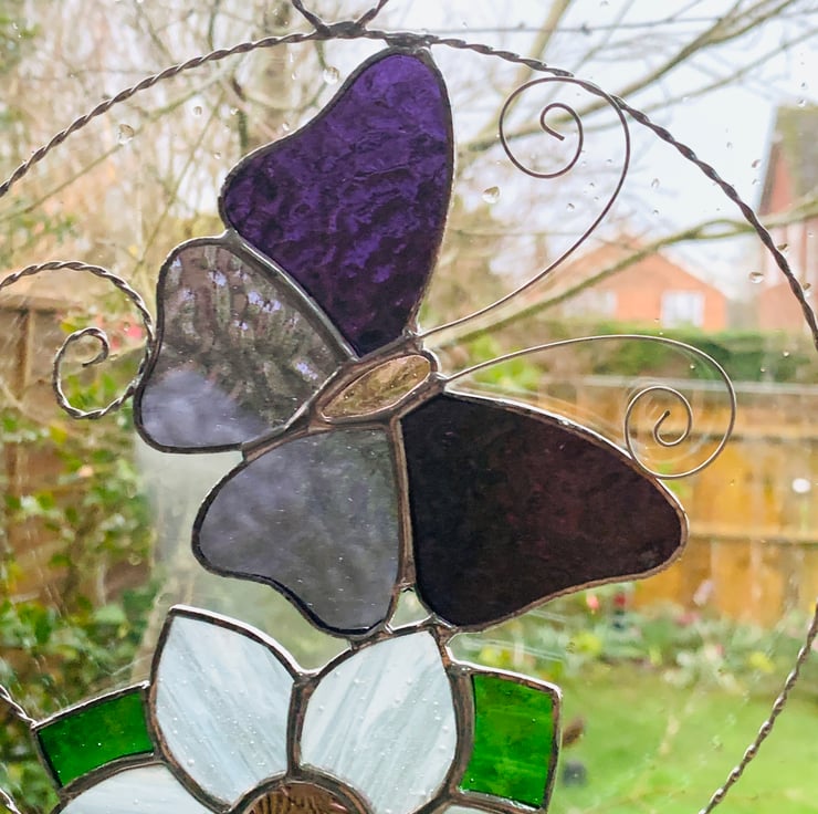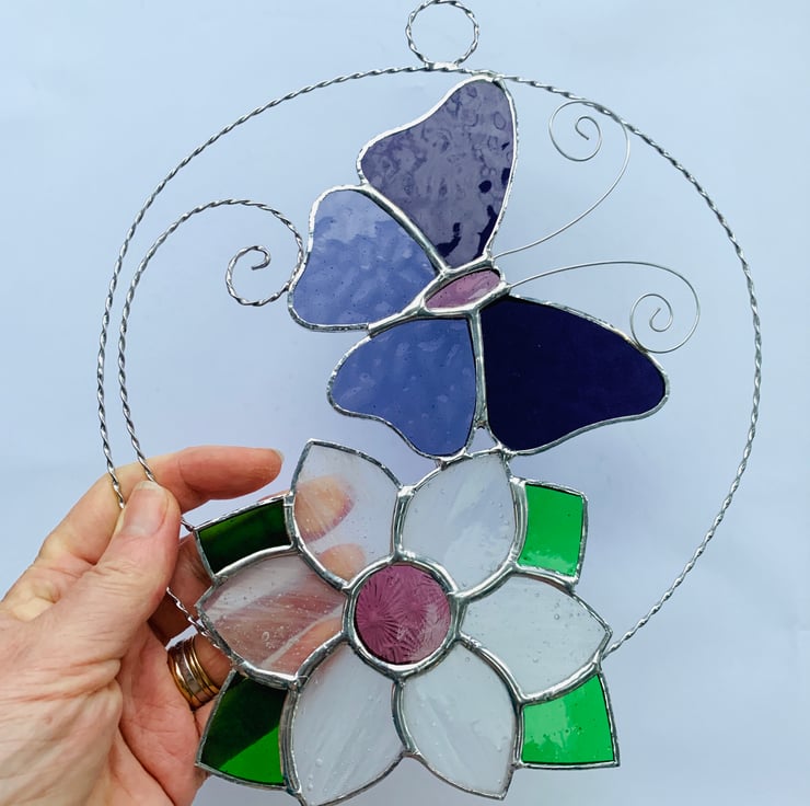 In the photograph this butterfly has been made from purple corella glass, mauve muffle glass and pink muffle glass. Twisted wire for the antenna. The flower has been made from white streaky sea glass with pink florentine glass and a lovely green sea glass for the leaves. I have used a twisted tinned wire for the circle and scroll to give a little more structure.