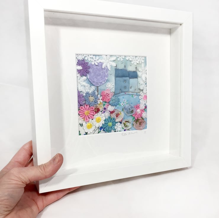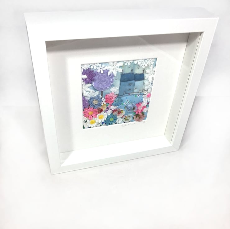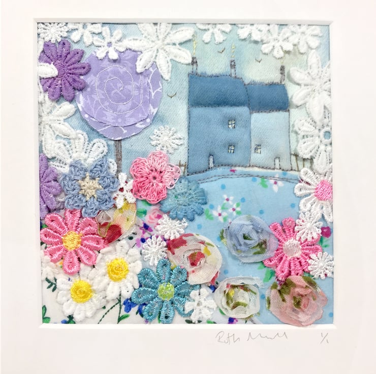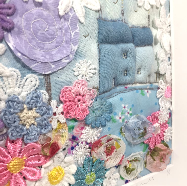 the picture is sewn on canvas, painted and stitched, with fabric added