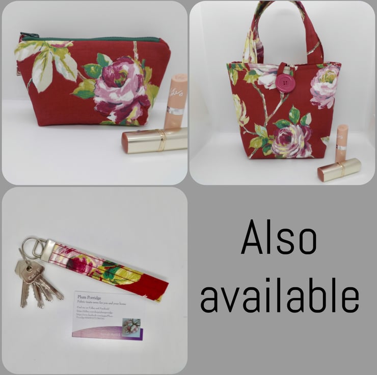 This tote bag has been made from a medium weight cotton fabric called 'Amaya. Red background with pink rose print. It is faced inside at the top with the same fabric for a professional finish and then lined with a green and grey striped cotton. I have inserted a key ring into one of the side seams, useful for clipping keys or purse safely inside your bag. I have interlined the long handles to make them more comfy.
