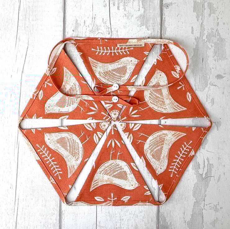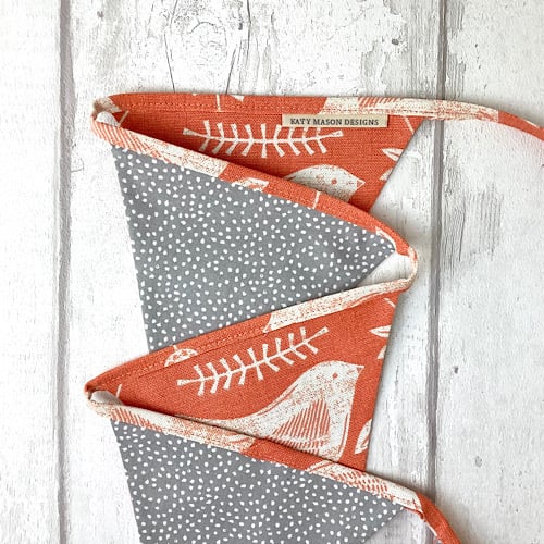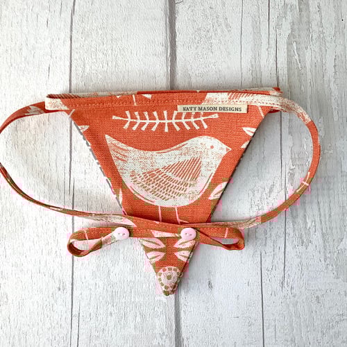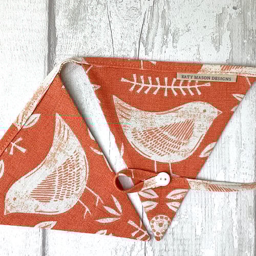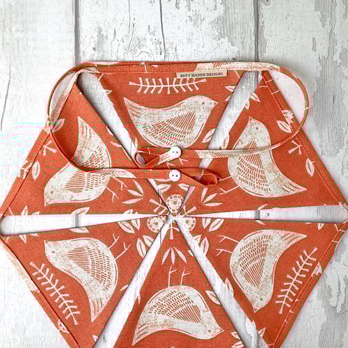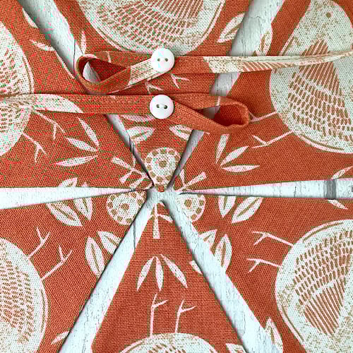 Pretty orange folk art style bunting. 7 flags approximately 165cm long with hanging loops and button detail. 30s style print cotton on the reverse.