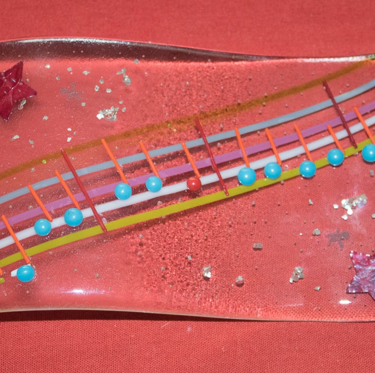 The notes are made from dots clipped from a glass rod, with short stringers. Once the piece had cooled, the notes were carefully positioned and held in place using Aloe Vera gel (which burns away in the kiln without leaving a residue). This time we used a tac fuse to securely stick the notes to the flat sheet glass.