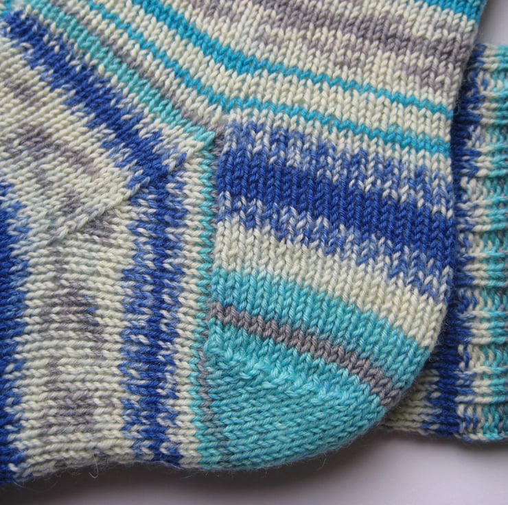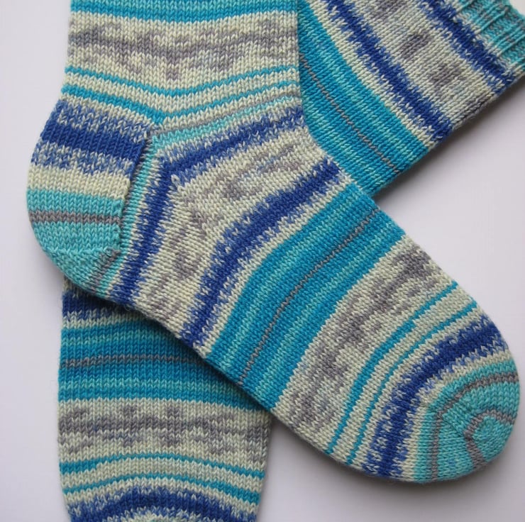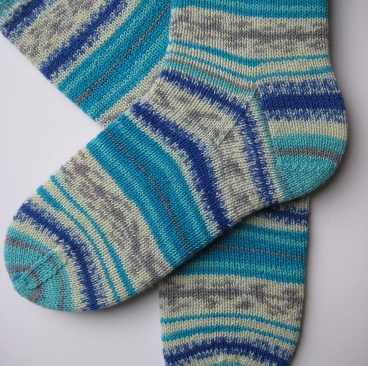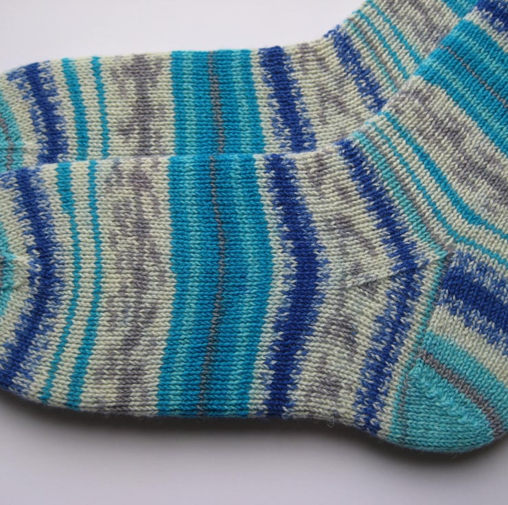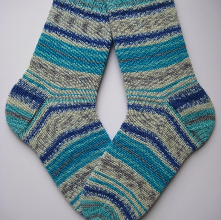 Hand knitted in the round on 5 double pointed needles, these wool socks are made from Zitron 4 ply self patterning sock yarn, 75% wool 25% polyamide, in shades of blue, cream and grey. Made from very fine yarn, they are not thick and will fit most footwear. Warm and durable, these socks will keep your feet comfortable and bright throughout the year.