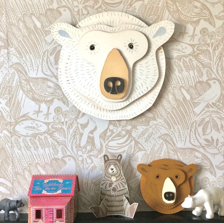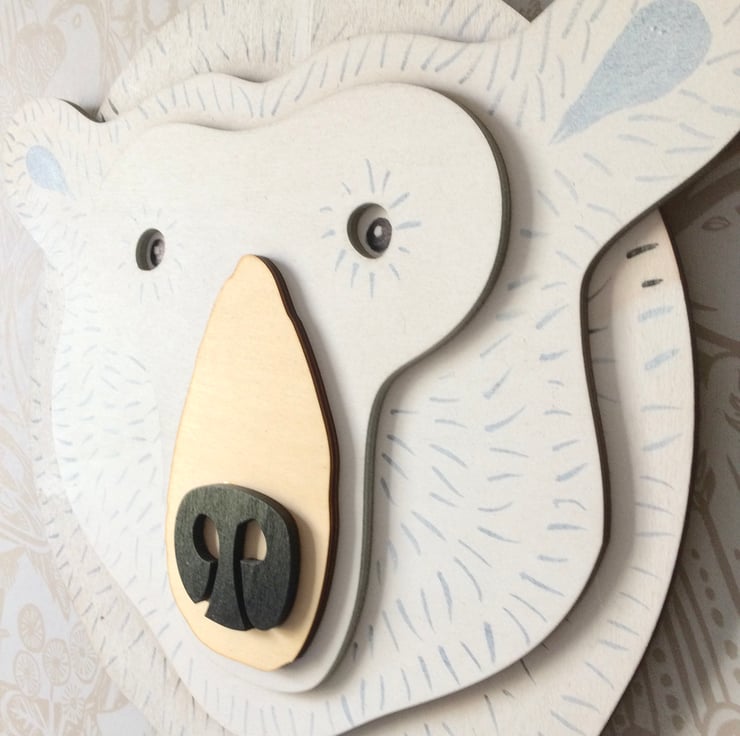This Polar Bear will keep an eye on whoever or whatever you want. Whether he's a friend for a child's bedroom wall or a welcoming presence in a hallway, he's sure to attract lots of attention! Hand painted head comprises five layers of FSC plywood with accent varnish for a wet-look nose, he measures in at approximately 40cm diameter and will be posted out to his new home carefully packaged and ready to hang wherever the mood takes him.