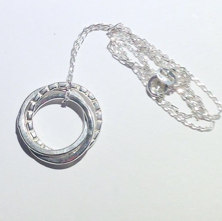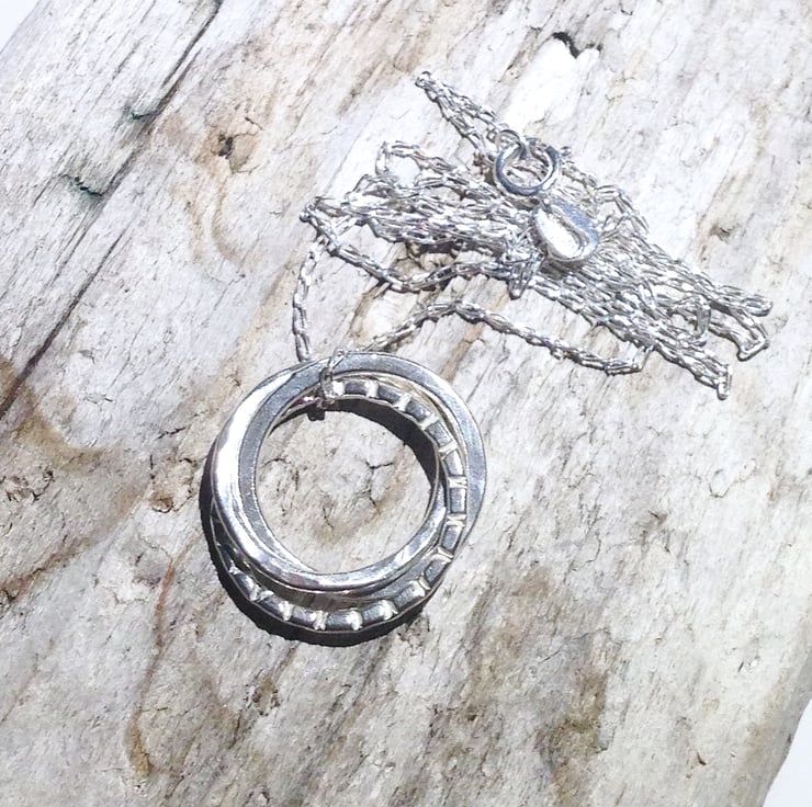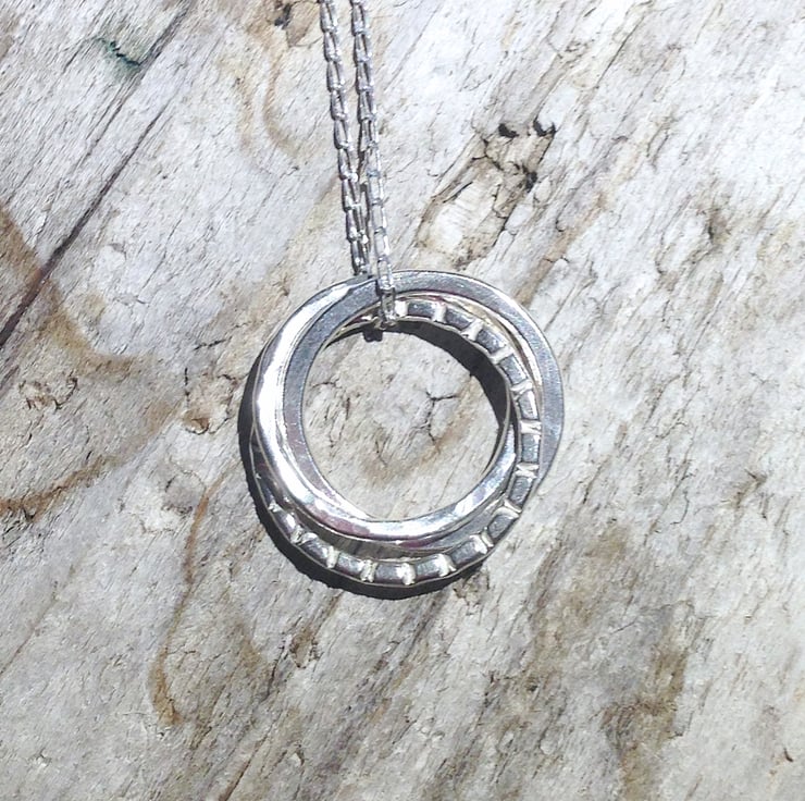 This beautiful pendant necklace is hand made from three intersecting sterling silver hoops, each with a different hammered finish hung on a 18 inch sterling silver chain.