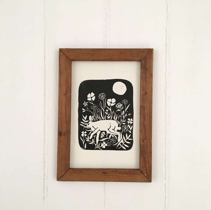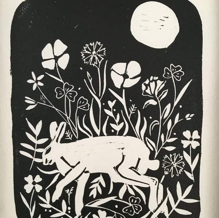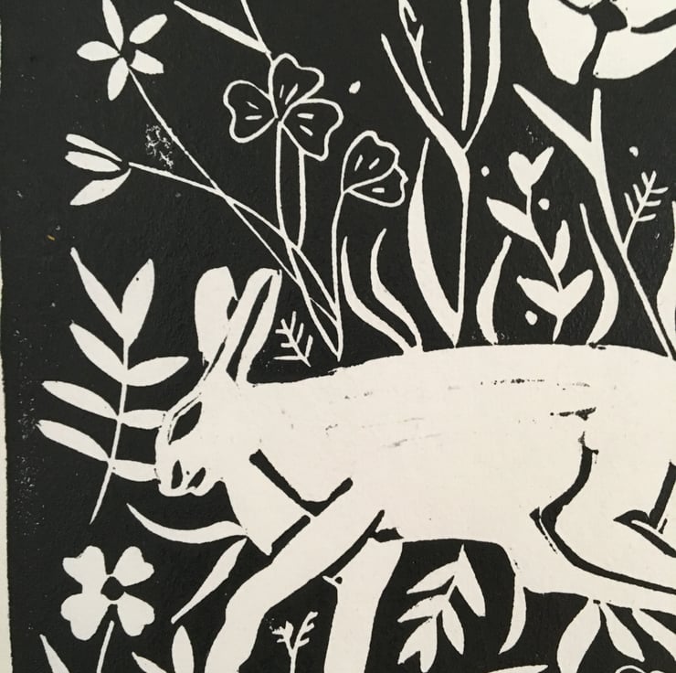 Linocut print of rabbit and wildflowers, Growth and Abundance