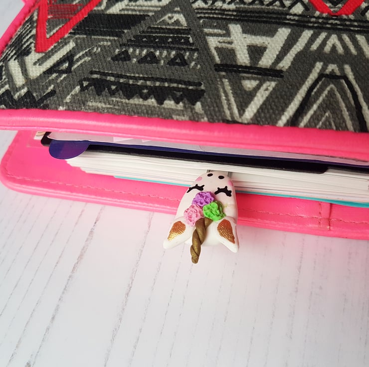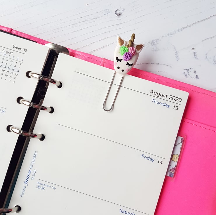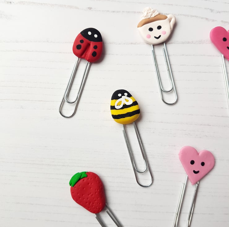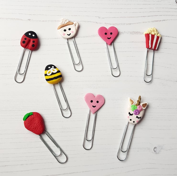 Each charm has been hand crafted by myself using polymer clay, finished off with detail carefully painted on with acrylic paint. The charm is then attached to a large sized metal paperclip, ready to pop into a planner or diary to hold your page. They could even be used as a cute alternative bookmark!