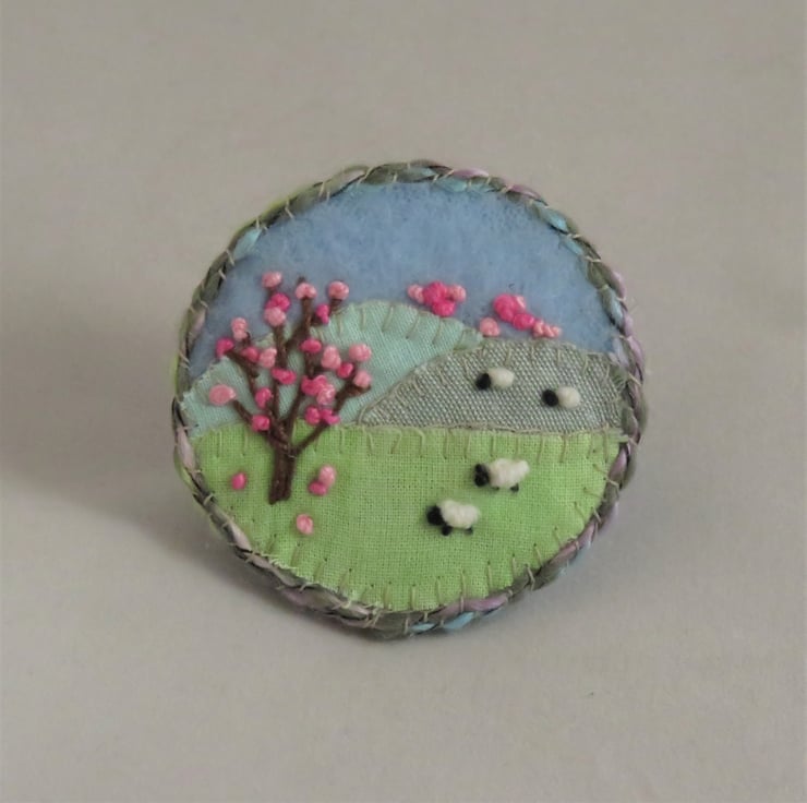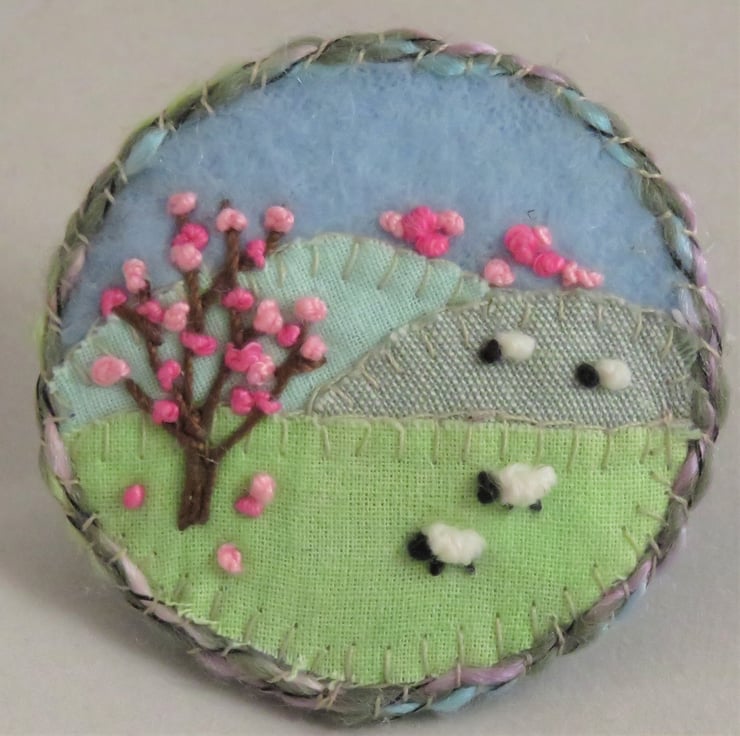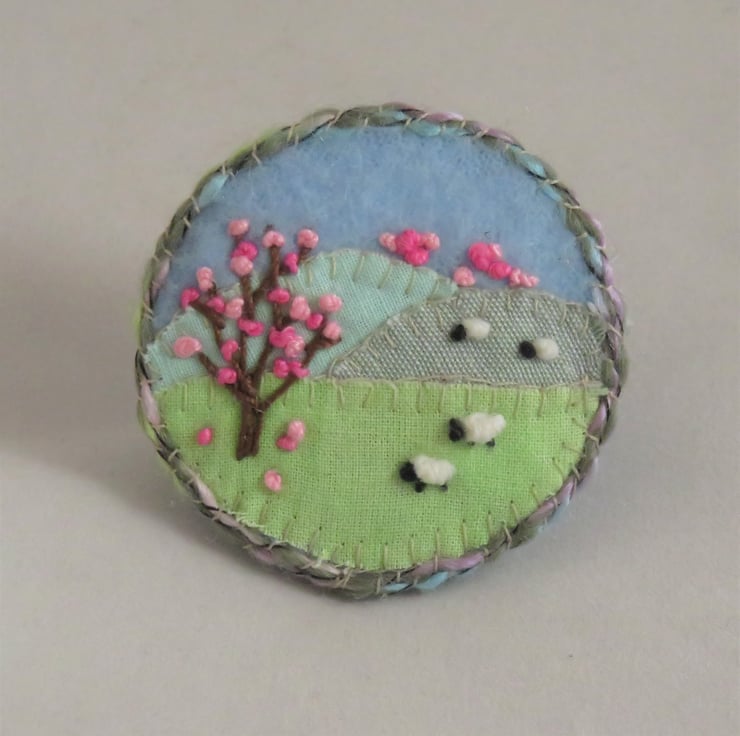 A pretty spring brooch featuring tiny embroidered sheep and trees festooned with pink blossom, on an appliqued landscape.