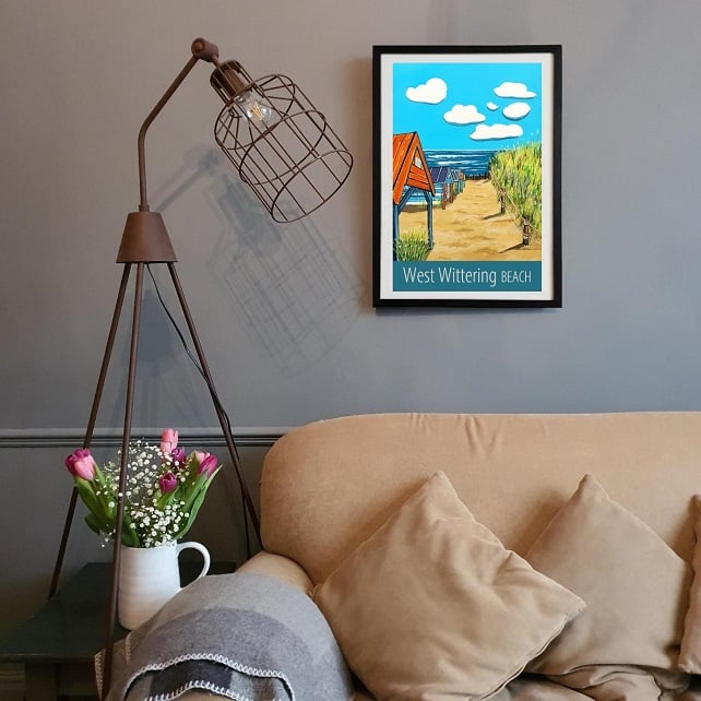 A contemporary travel poster style print of the view of the beach huts on West Wittering beach in West Sussex, from my own original acrylic painting.