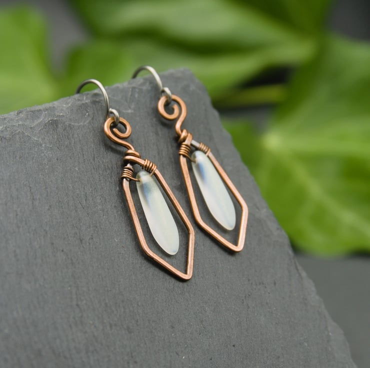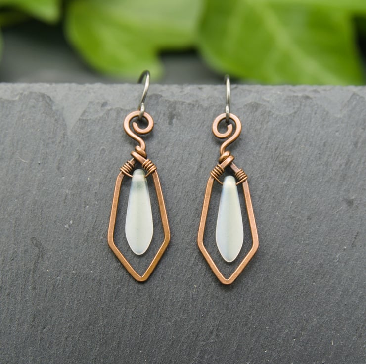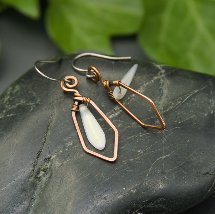 These striking earrings feature frosted white glass dagger beads. I've formed frames for the beads using copper wire, which I've hammered flat. The beads are attached with fine wire so that they hang & move within the frame. The AB finish on the beads gives them a slightly shimmering appearance.
