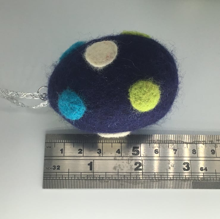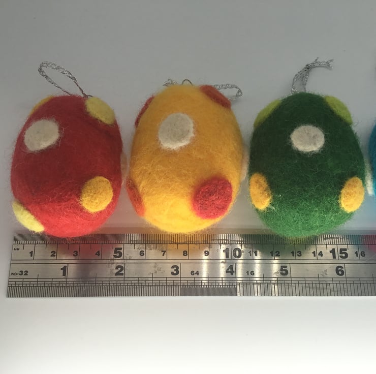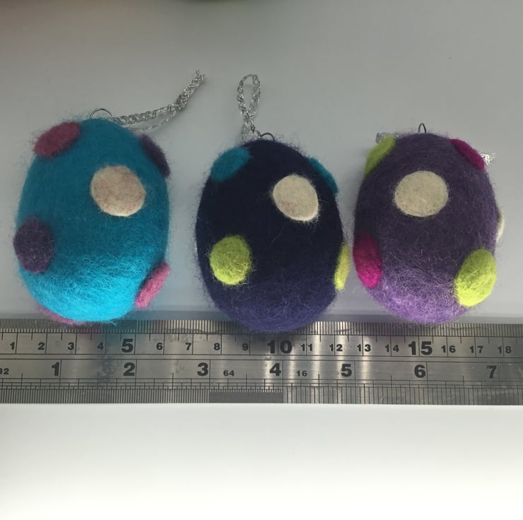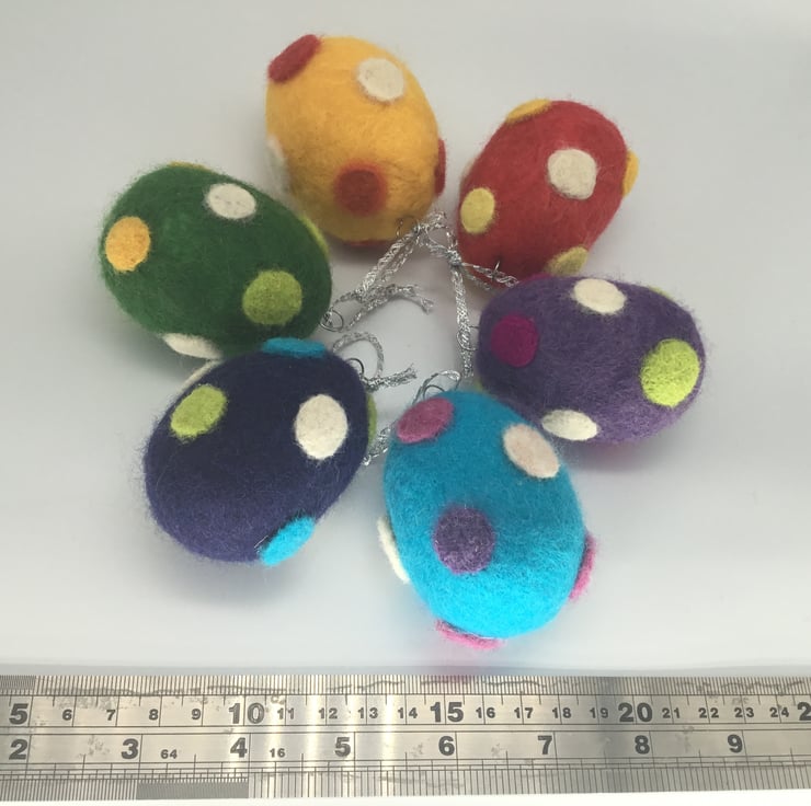 The eggs have been wet felted with merino wool around a polystyrene centre and then decorated with the addition of needle felted polka dots.