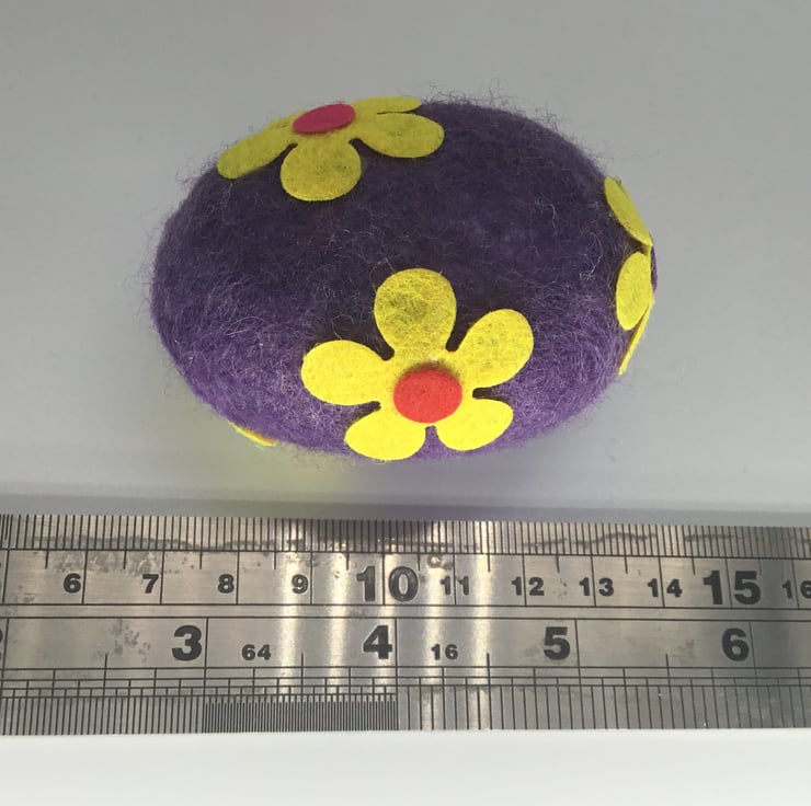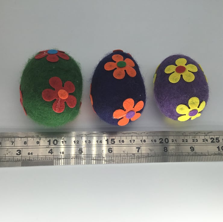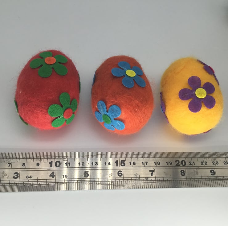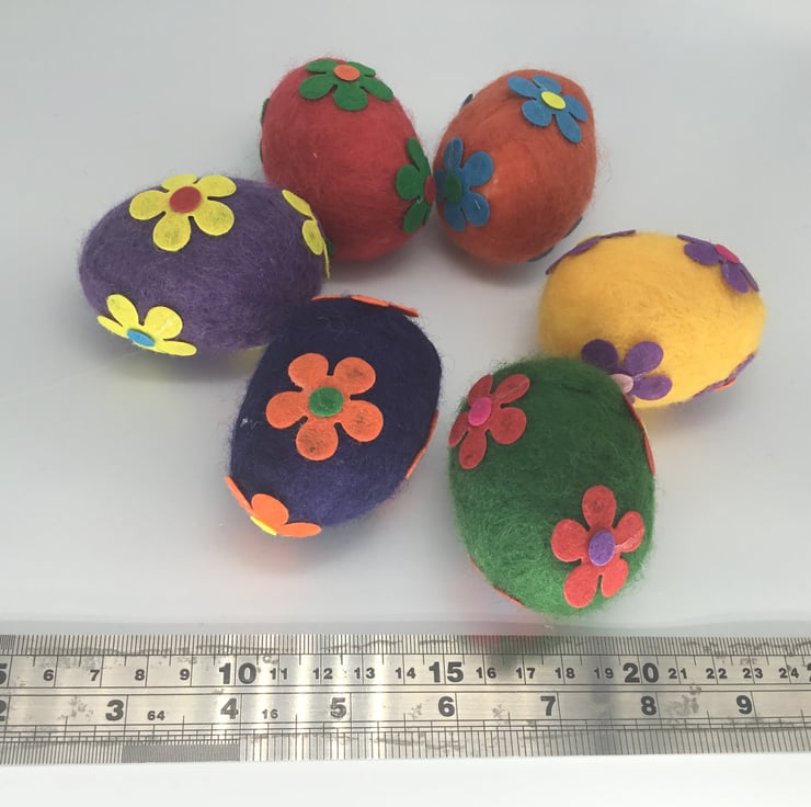 The eggs have been wet felted with merino wool around a polystyrene centre and then decorated with the addition of felt flowers.
