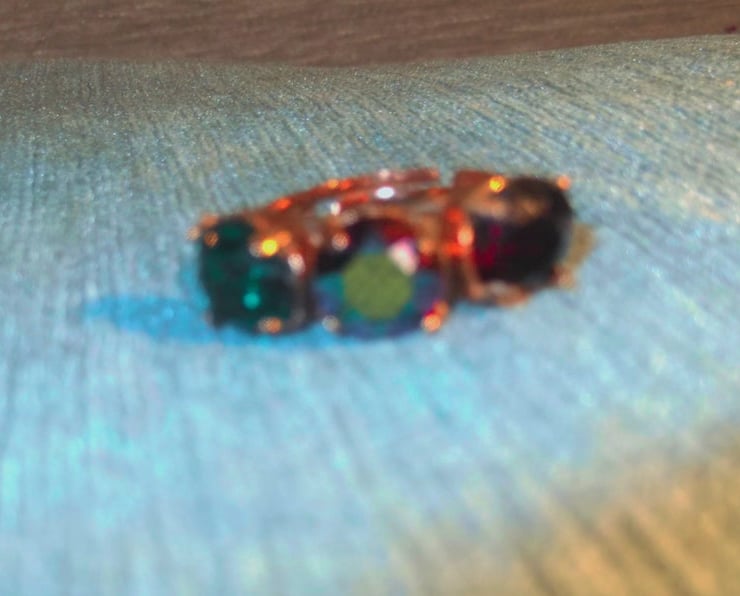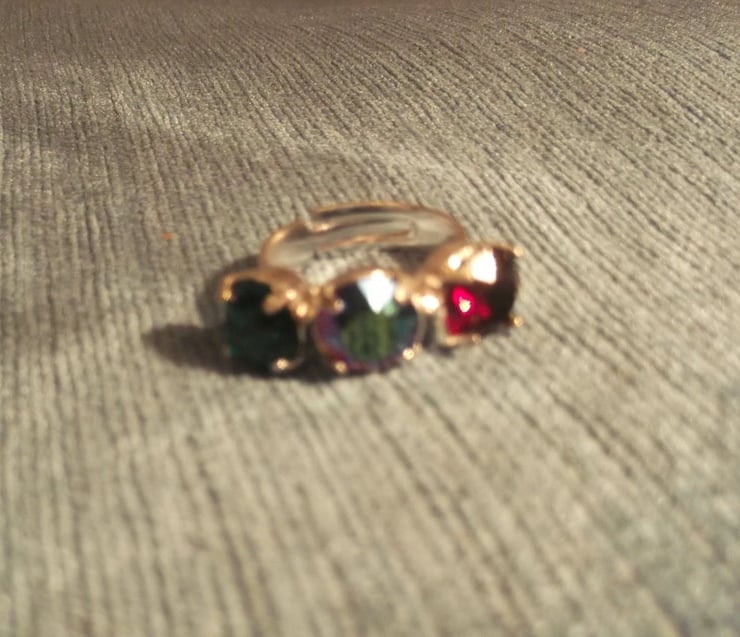 8mm Emerald F, Scarabaeus Green and Garnet Swarovski chatons in an adjustable ring setting. Available in rose gold plated and silver plated.