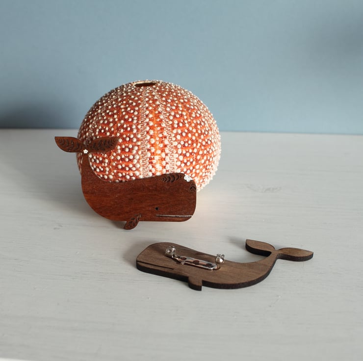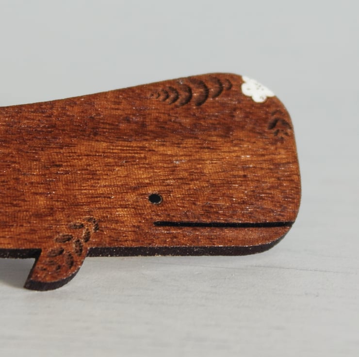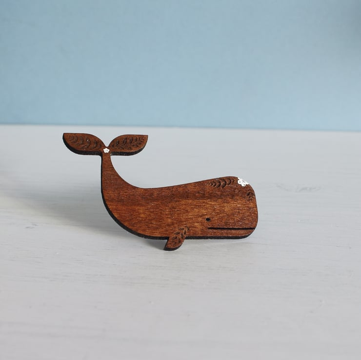 This little brooch measures 70mm at it's widest and 46mm in height, including tail fin. He's cut from 3mm solid walnut and features an etched floral pattern with little white flowers. Finished with a gloss varnish, to keep them looking lovely for longer.